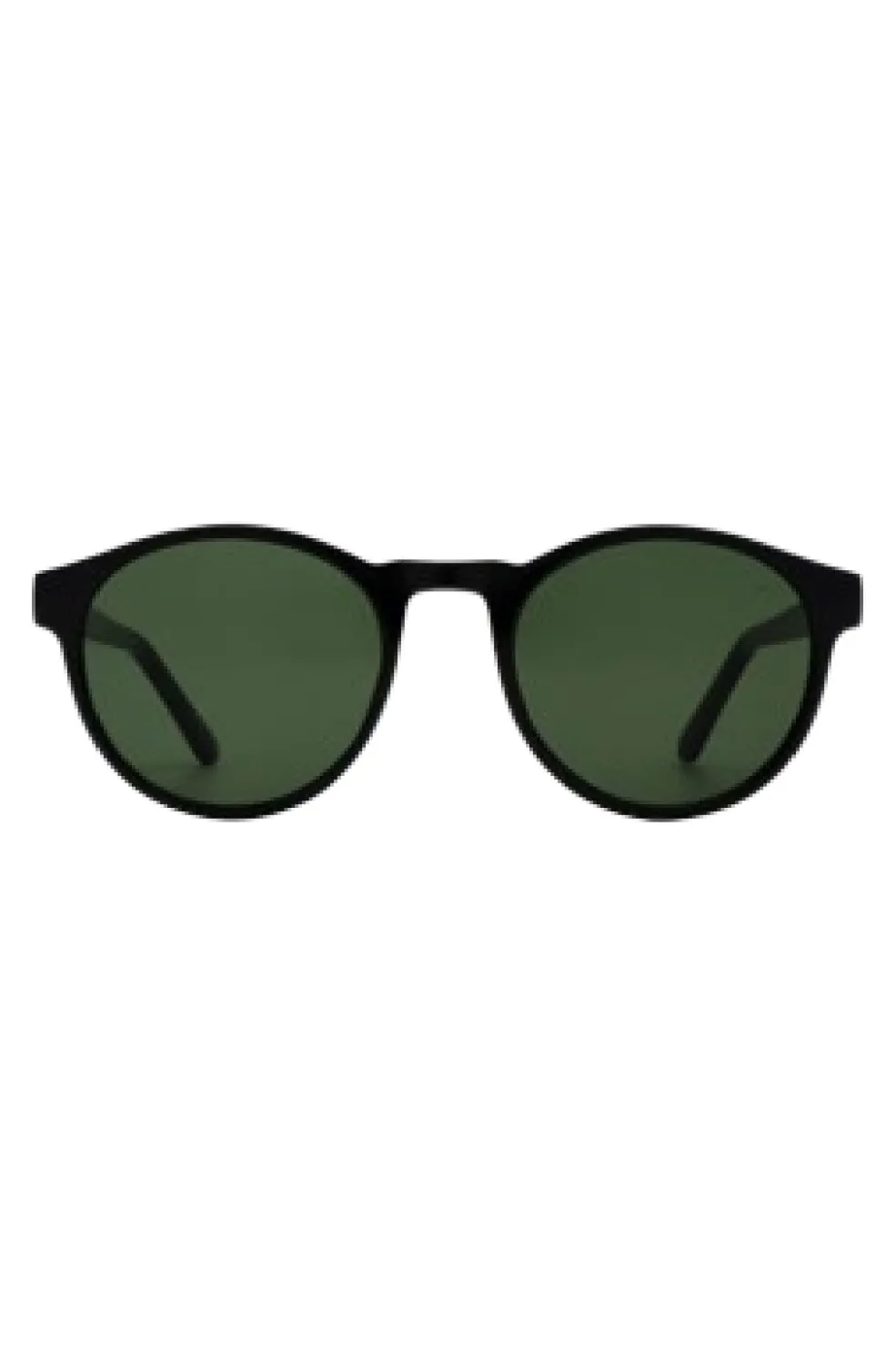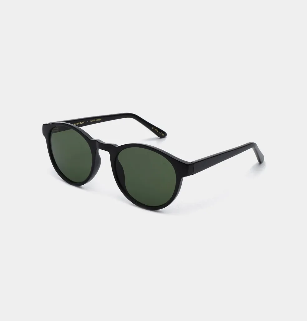 Sorte solbriller fra A. Kjærbede med rund form og mørkegrønne linser. Solbrillerne har UV 400-beskyttelse og formbare stænger med metalkerner til individuel tilpasning.