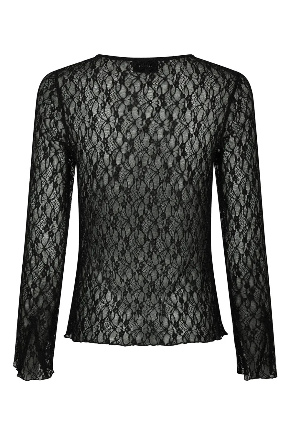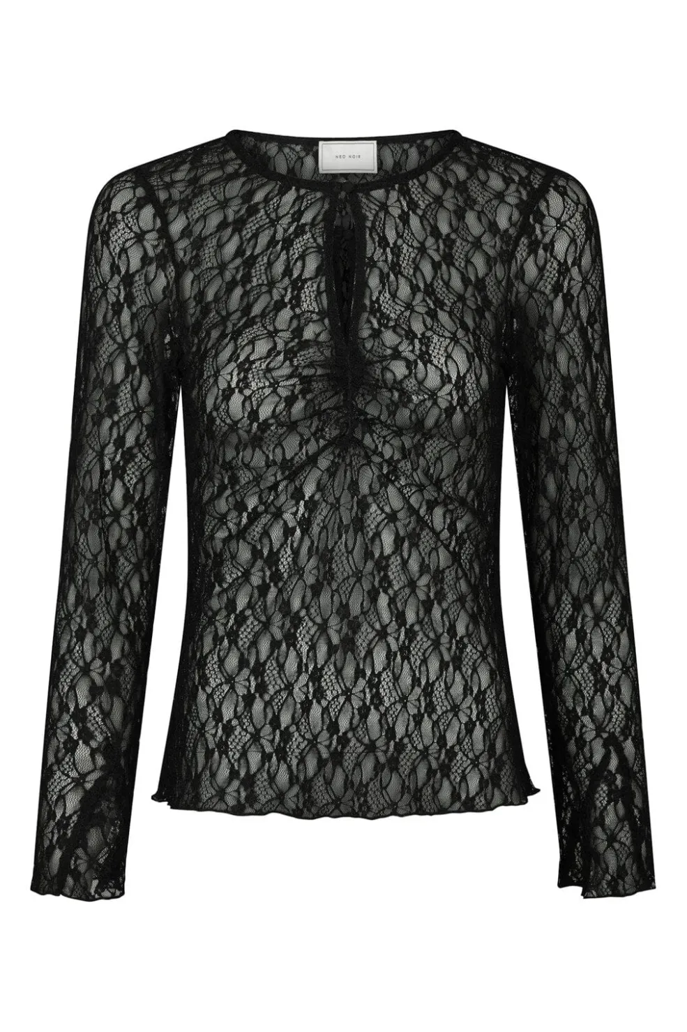 Sort blondebluse fra Neo Noir med gennemsigtigt stof og blomstermønster. Blusen har en rund hals med nøglehulsudskæring og én knap foran. Den tætsiddende model har lange ærmer.