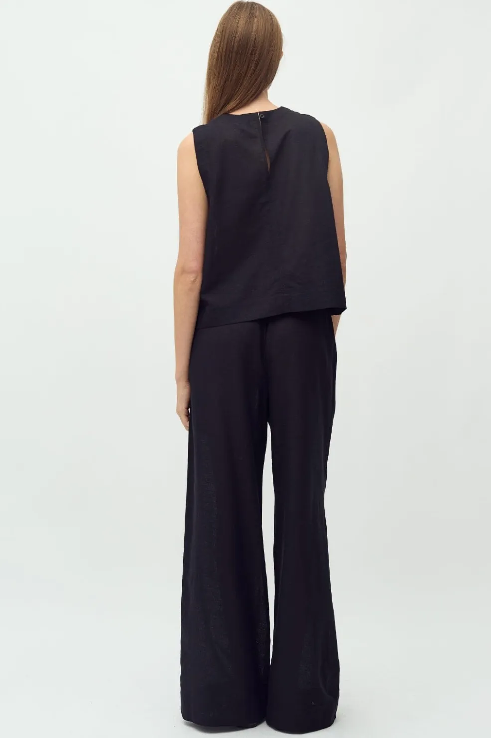 Sorte bukser fra MbyM med vide ben og læglang længde. Bukserne har en elastisk talje og sidelommer, hvilket gør dem praktiske til hverdagsbrug.