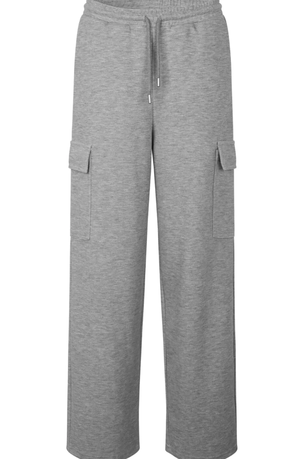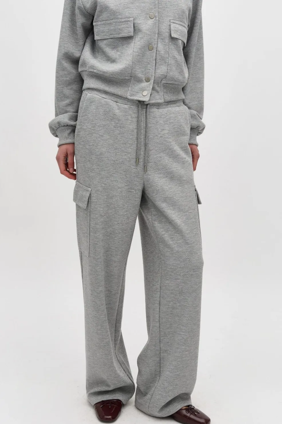 Grå sweatpants fra MbyM med cargo-lommer på siderne. Bukserne har en regulær pasform og gulvlængde. Snørelukningen i taljen giver mulighed for at justere vidden.