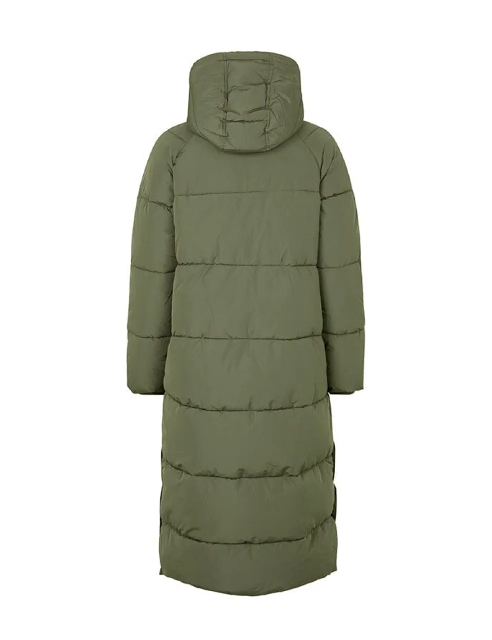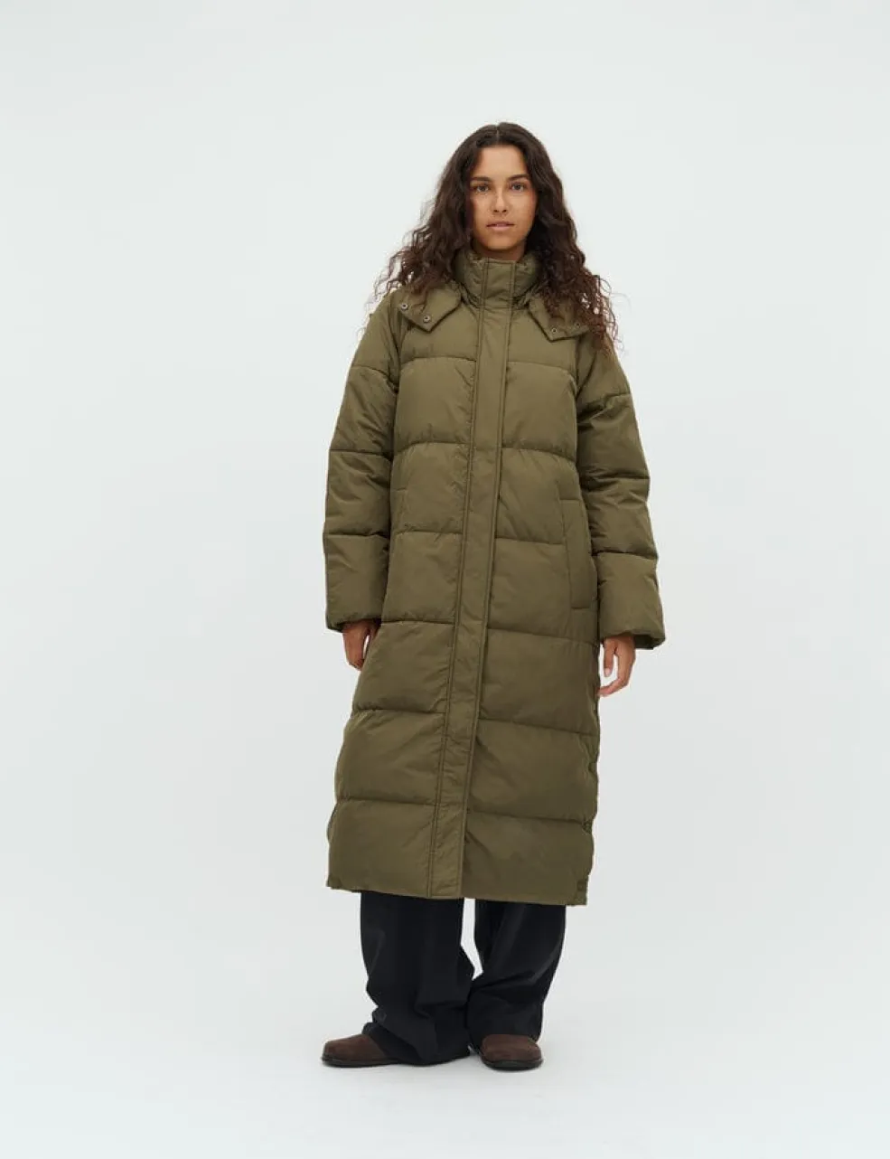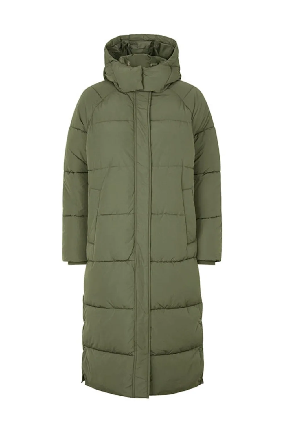 Lang quiltet frakke fra MbyM i olivengrøn. Frakken har horisontale sømme, hætte med høj krave og sidelommer.