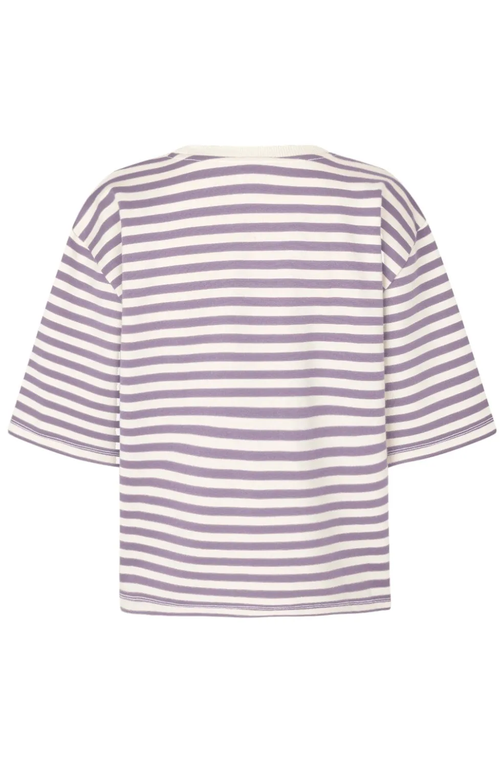 Stribet t-shirt fra MbyM med vandrette striber i lys lilla og cremehvid. T-shirten har en rund halsudskæring og korte ærmer med en afslappet pasform.