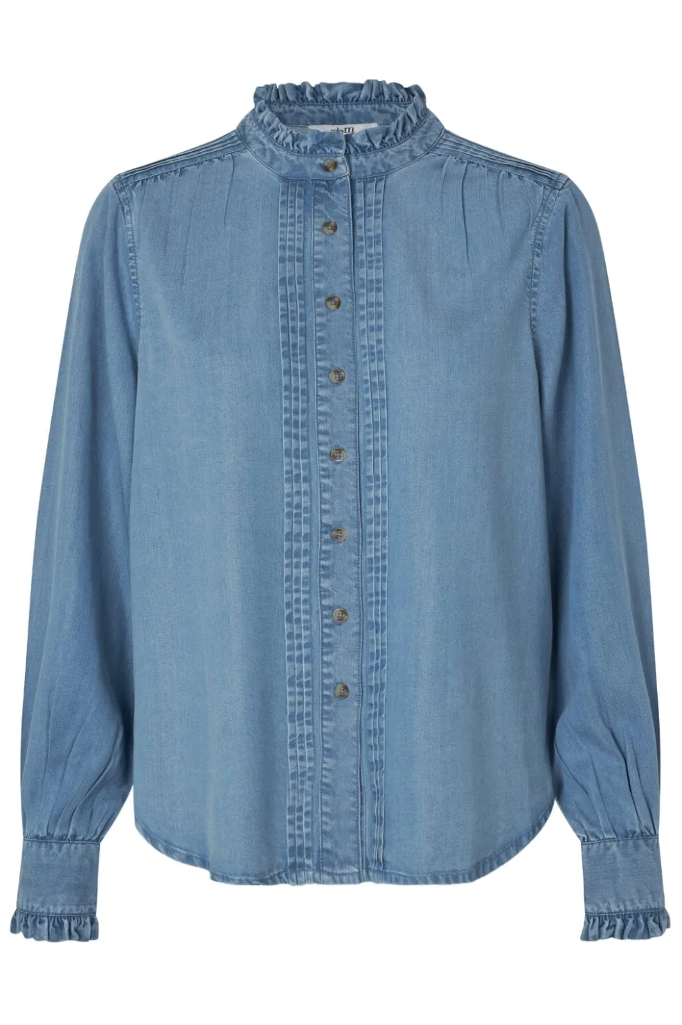 Lyseblå bluse fra MbyM med rynkede detaljer ved kraven og manchetterne. Blusen har en høj hals og lukkes med knapper foran.