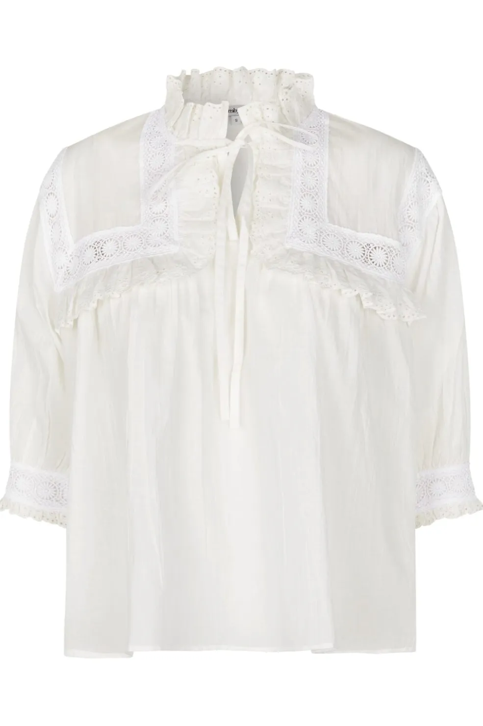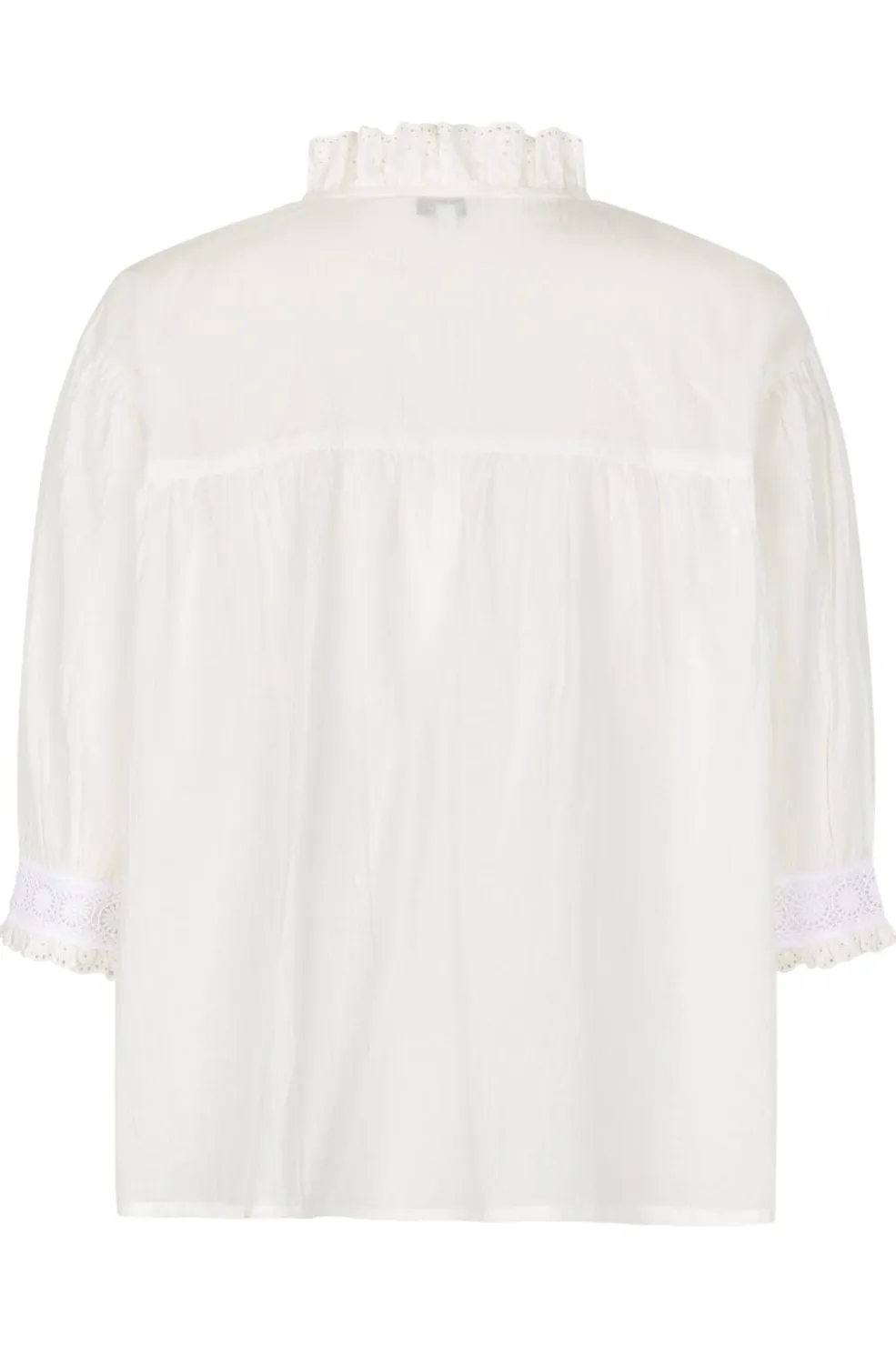 Hvid bluse fra MbyM med rynket høj hals og blondedetaljer. Blusen har 3/4 ærmer med blondekant og snøredetaljer ved halsen. Let og luftigt design i bomuldsstof.