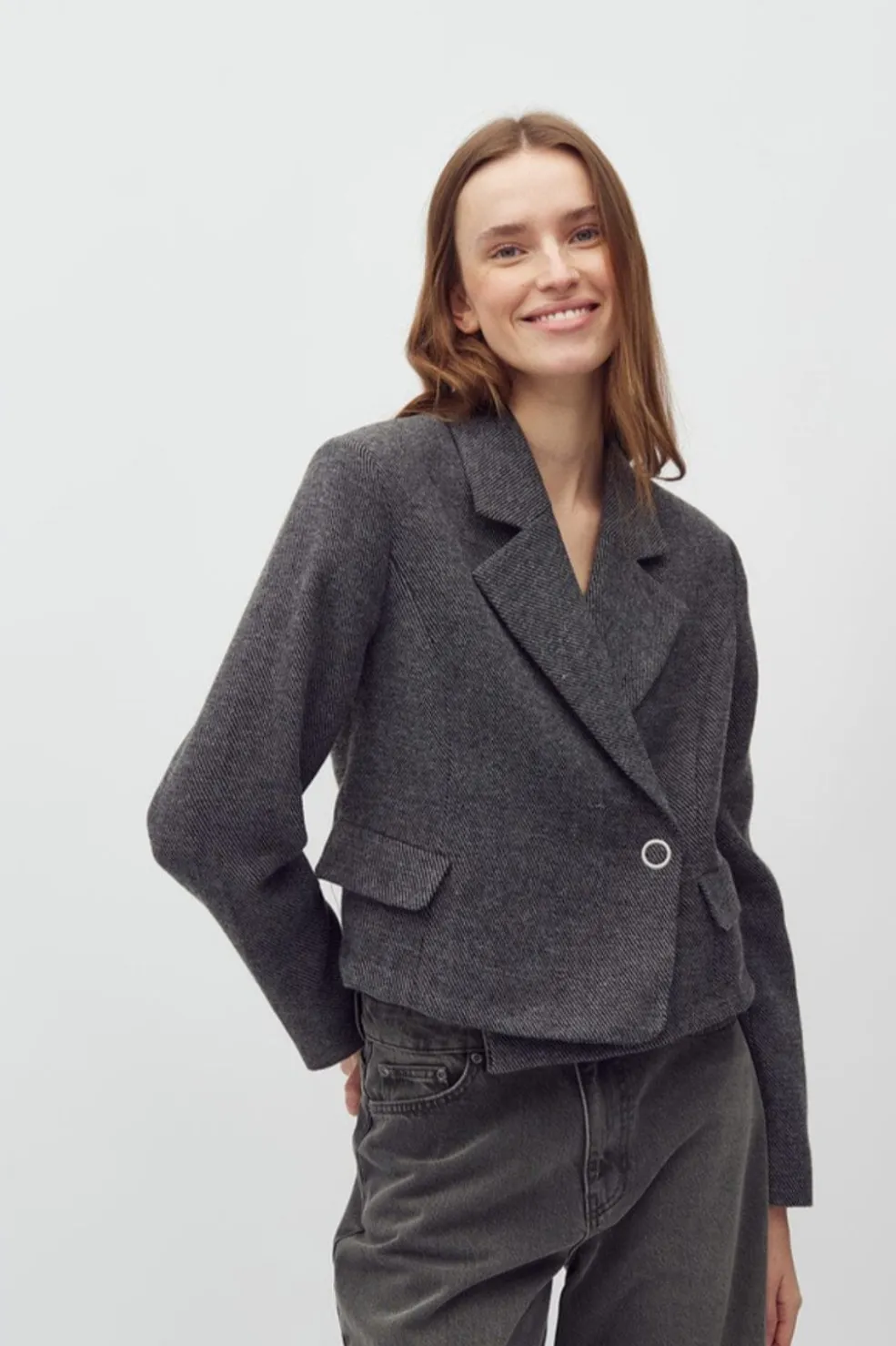 Sort twill-blazer fra MbyM med sildebensmønster. Blazeren har en cropped længde og kan bruges til både hverdag og fest. Den grå og sorte farve gør den nem at kombinere med andet tøj.