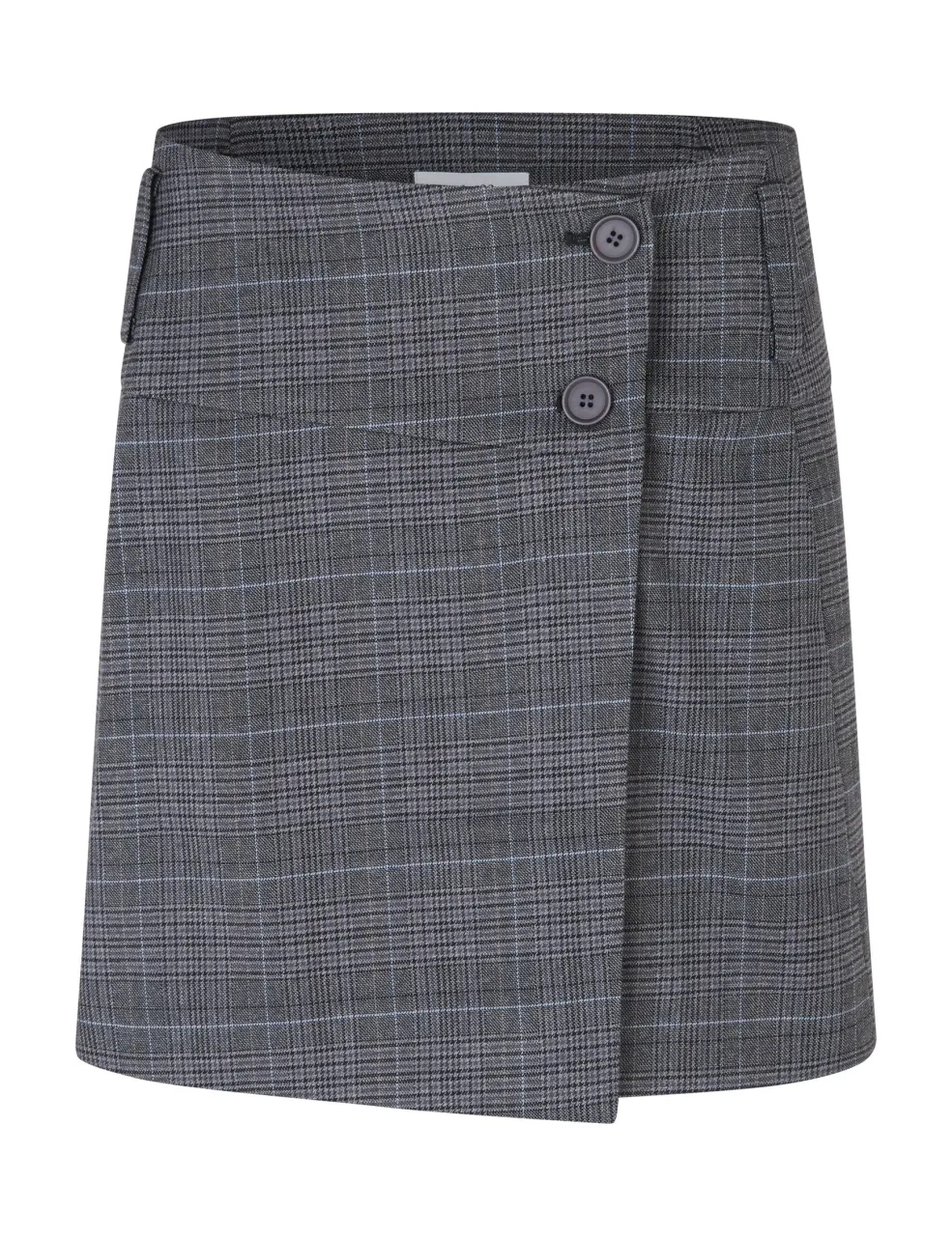 Gråternet nederdel fra MbyM med wrap-design. Nederdelen har to knapper på fronten og en længde til midt på låret.