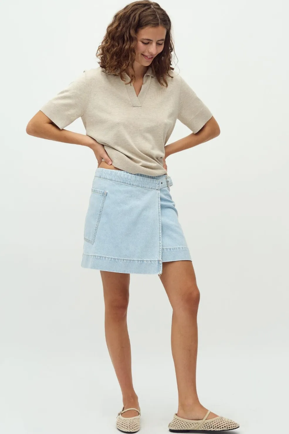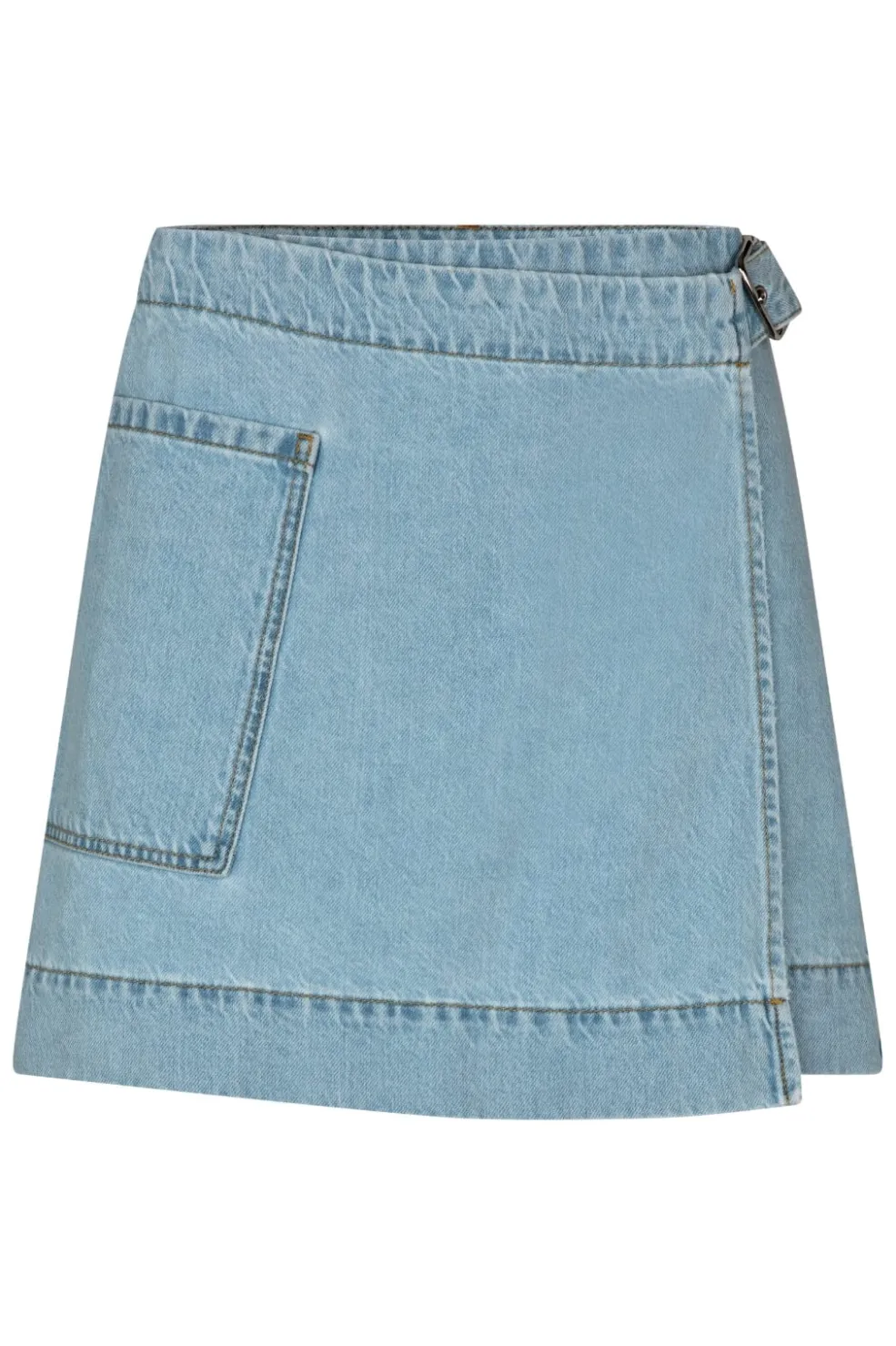 Denimnederdel fra MbyM i en lys blå vask. Nederdelen har et omslagsdesign med spænde og en praktisk sidelomme. Den har en normal pasform og er fremstillet af denim.