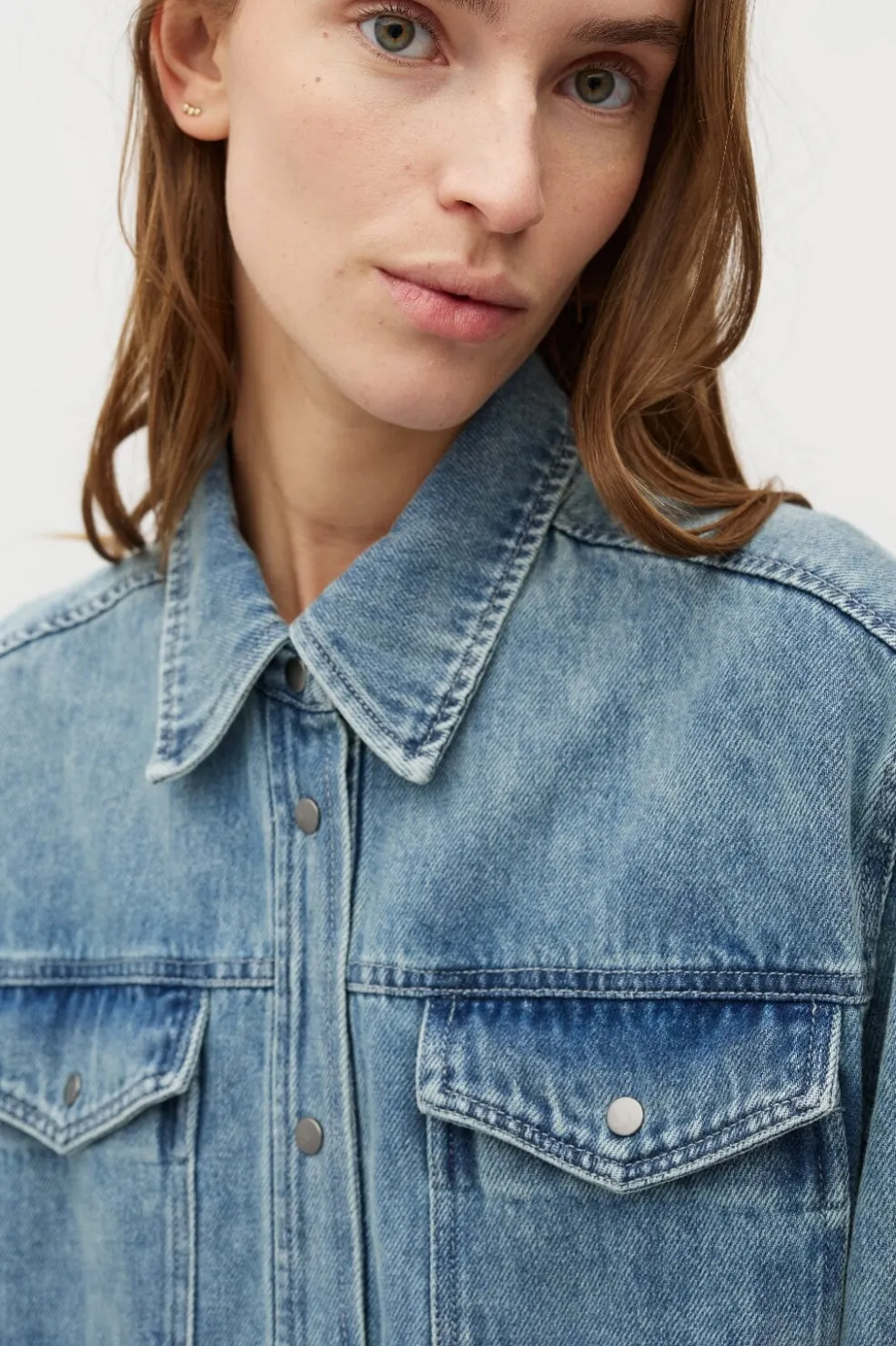 Denimskjorte fra MbyM i lys blå bomuld med en acid wash-effekt. Skjorten har en klassisk skjortekrave og lukkes med trykknapper foran.