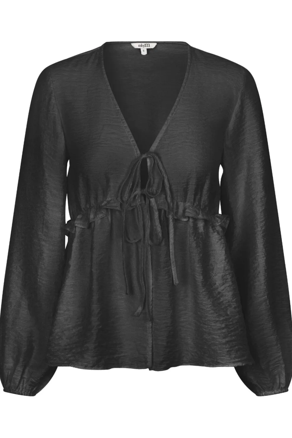 Sort bluse fra MbyM med lange ballonærmer og V-udskæring. Blusen har bindebånd i taljen og flæsedetaljer, der giver den et blødt fald.