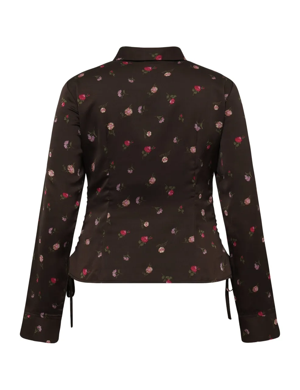 Skjorte fra MbyM med et flerfarvet blomsterprint i lyserøde og lilla nuancer på en mørk baggrund. Skjorten har en slim fit-pasform.