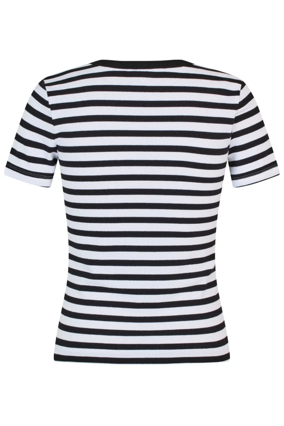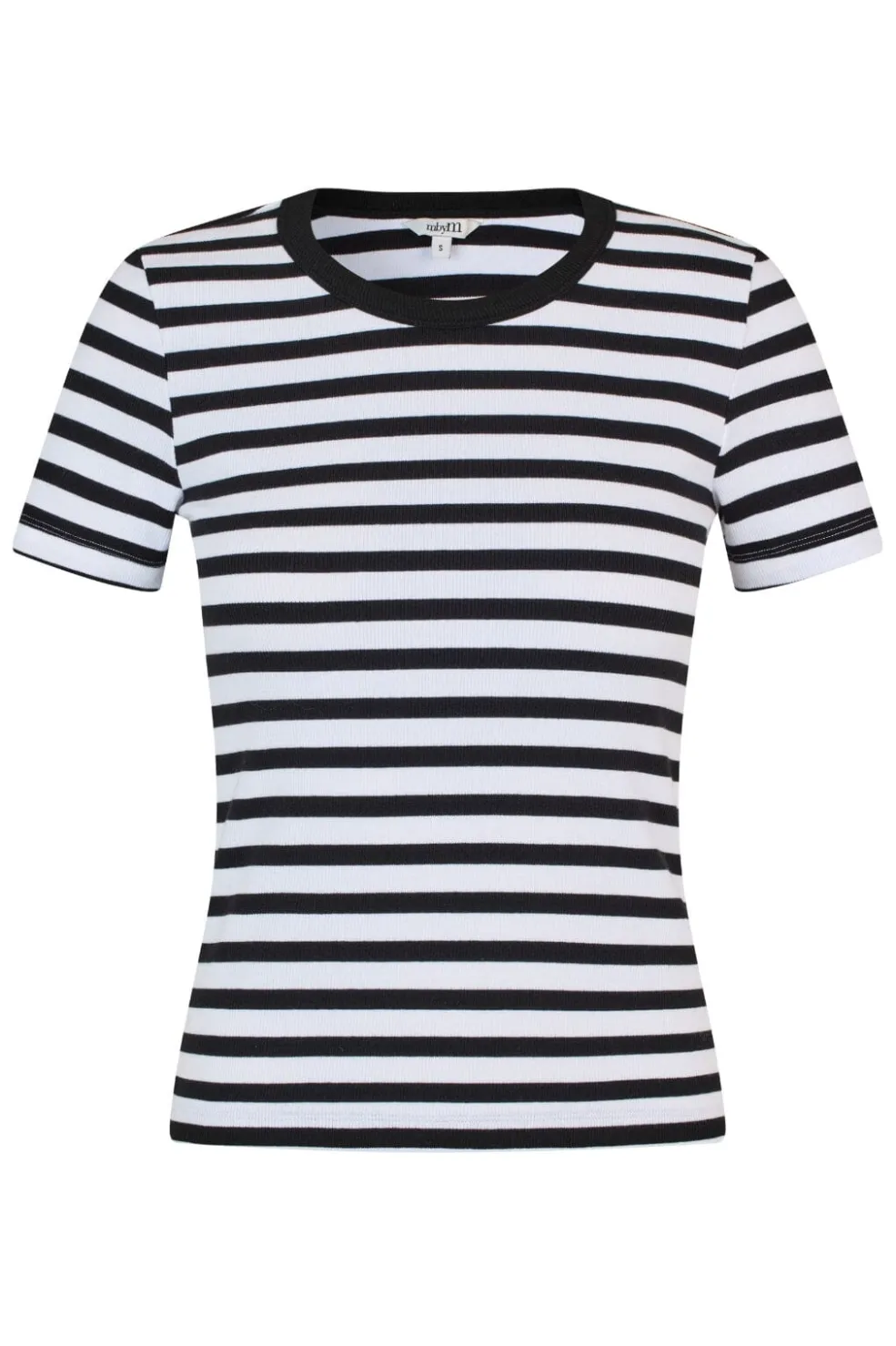 Sort-hvid stribet t-shirt fra MbyM med rund halsudskæring og korte ærmer. T-shirten har en enkel og klassisk stil med striber i kontrasterende farver.