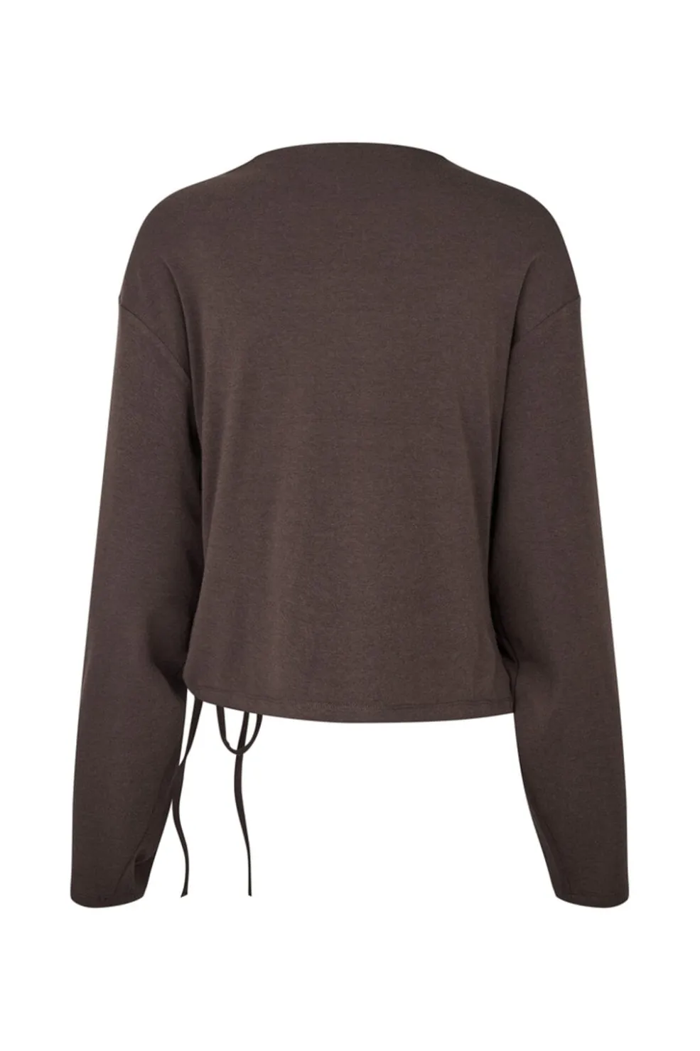 Mørkebrun langærmet top fra MbyM med asymmetrisk rynket detalje på siden. Toppen har justerbare snore og en rund halsudskæring.