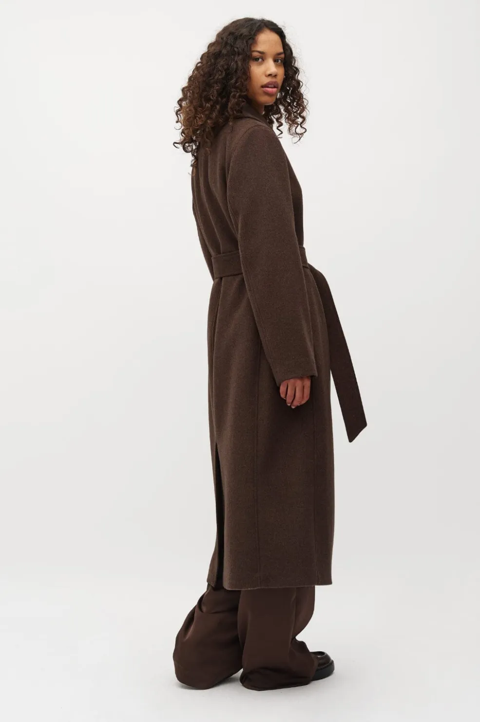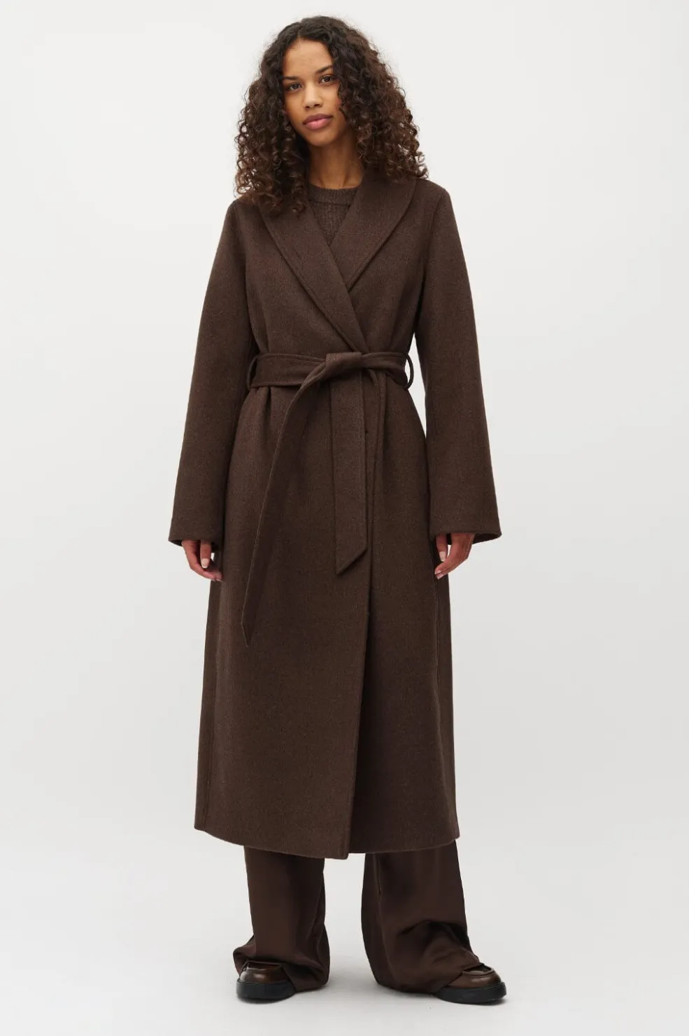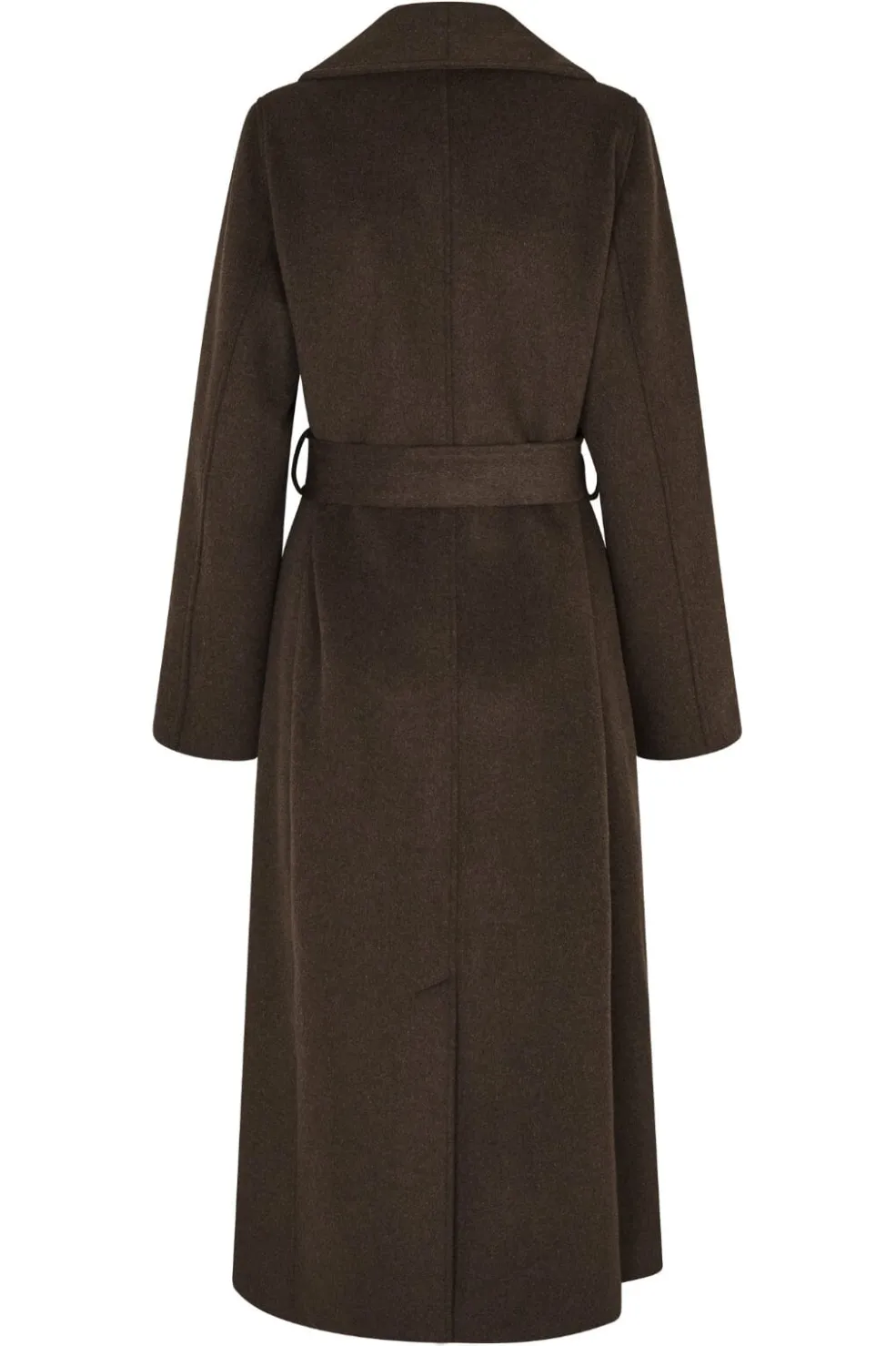 Lang frakke fra MbyM i brun. Frakken har et bindebælte i taljen og en bred krave. Den når under knæene.