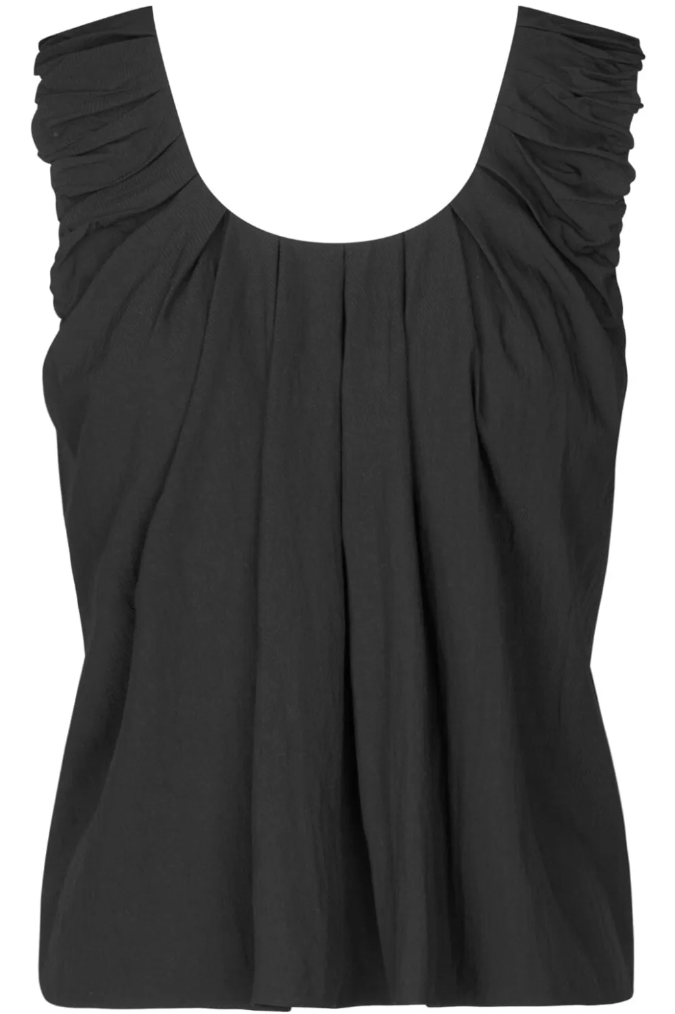 Sort ærmeløs top fra MbyM med flæsedetaljer på skuldrene. Toppen har en rund halsudskæring og samlet stof, der skaber et blødt fald ned over kroppen.