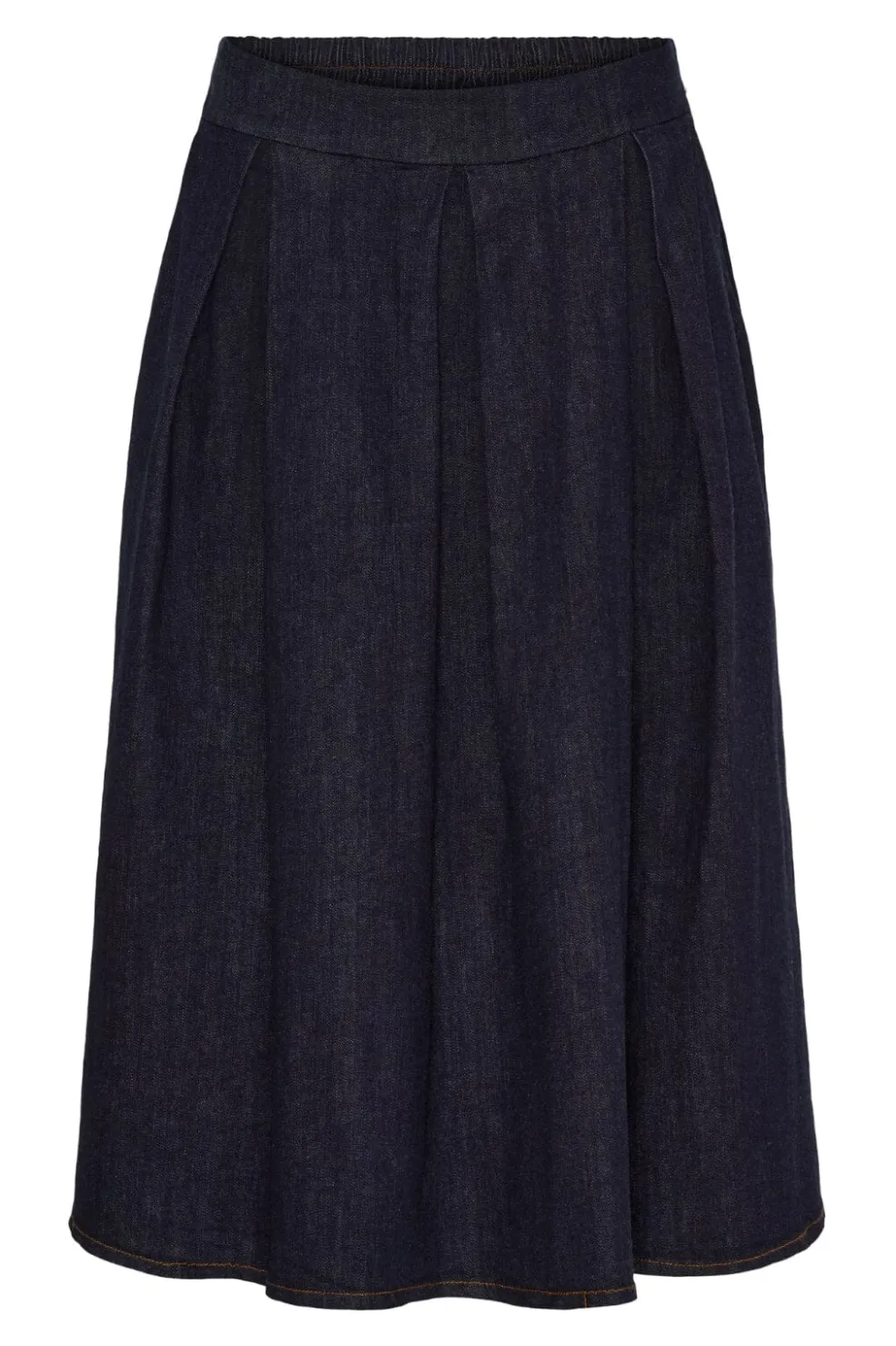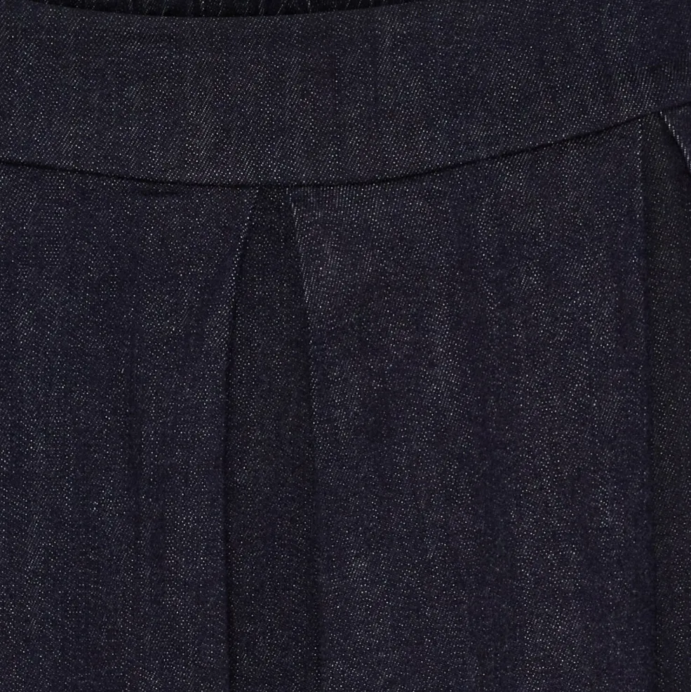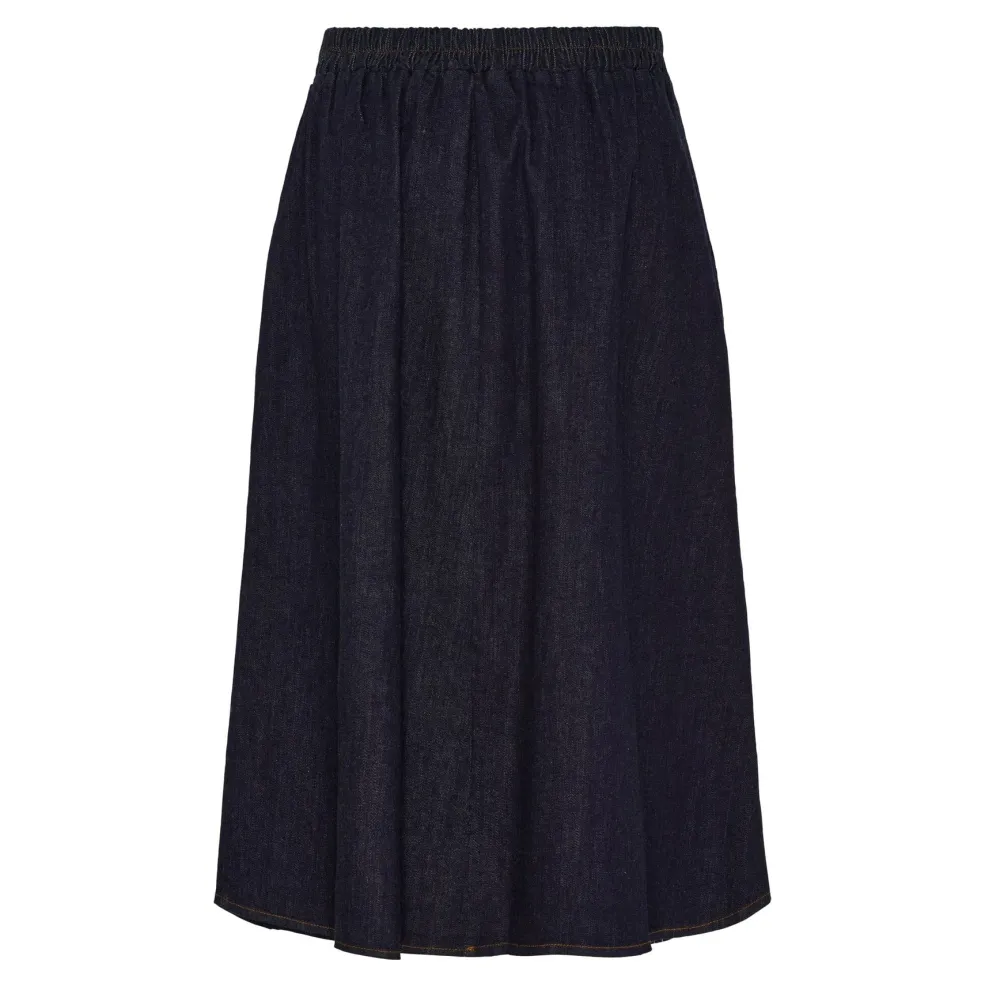 Mørkeblå nederdel fra Marta Du Chateau. Nederdelen har en høj talje, lægdetaljer foran og en bred linning med dekorative syninger.