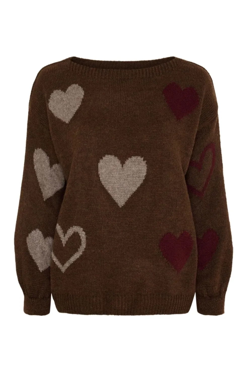 Brun strik fra Marta Du Chateau med hjerteformede mønstre på forsiden i grå og bordeaux. Bagsiden er ensfarvet brun uden mønstre.