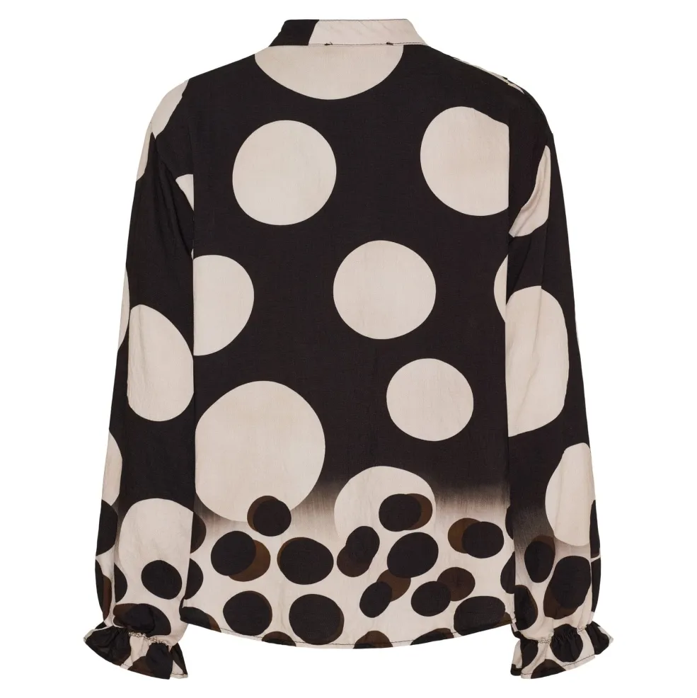 Sort skjorte fra Marta Du Chateau med store, lyse prikker og ombre-effekt. Skjorten har en løs pasform med skjortekrave og lange ærmer med rynket kant.