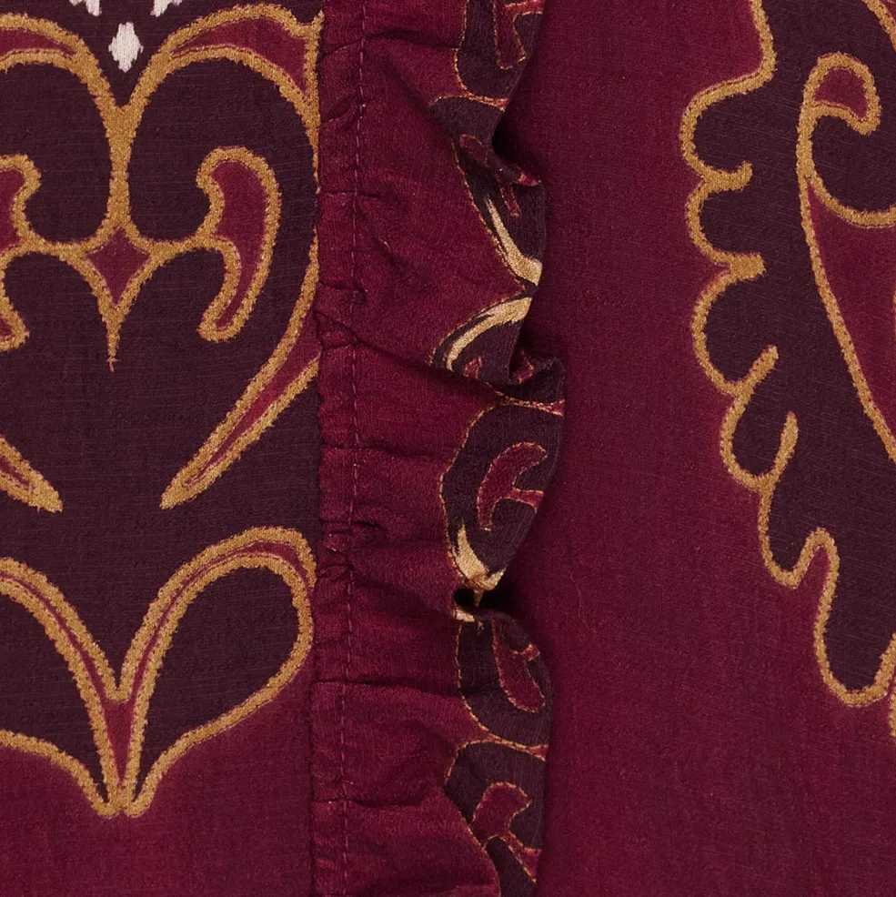 Bordeaux skjorte fra Marta Du Chateau med paisley- og blomstermønster. Skjorten har lange ærmer og en V-hals med flæsedetaljer langs knaplukningen foran.
