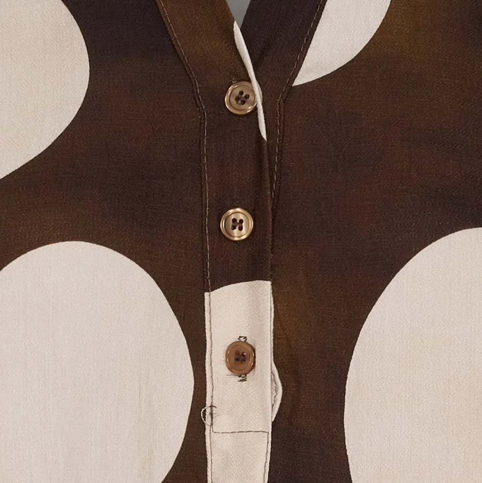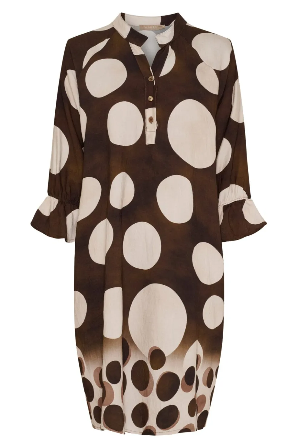 Brun kjole fra Marta Du Chateau med store, lyse prikker på mørk bund. Kjolen har skjortekrave og 3/4-ærmer med flæsedetaljer ved manchetterne.