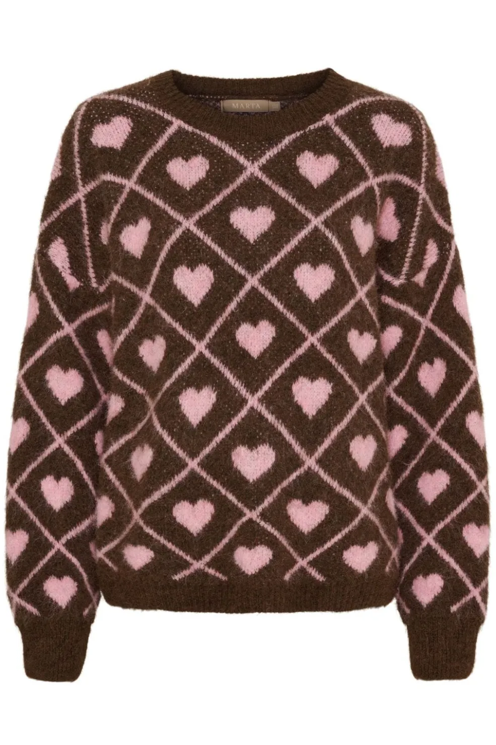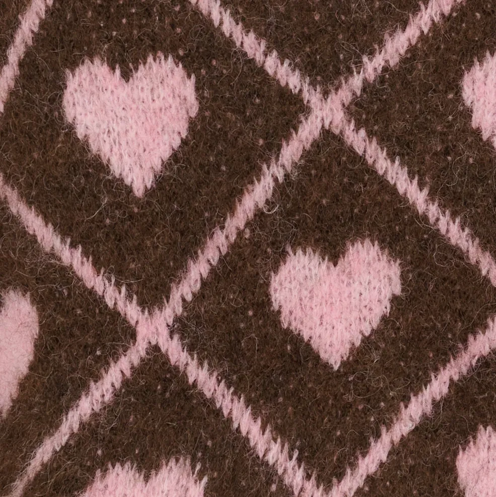 Brun striktrøje fra Marta Du Chateau med lyserøde hjerter i ternmønster. Trøjen har rund hals og lange ærmer, der giver god varme til de kølige dage.