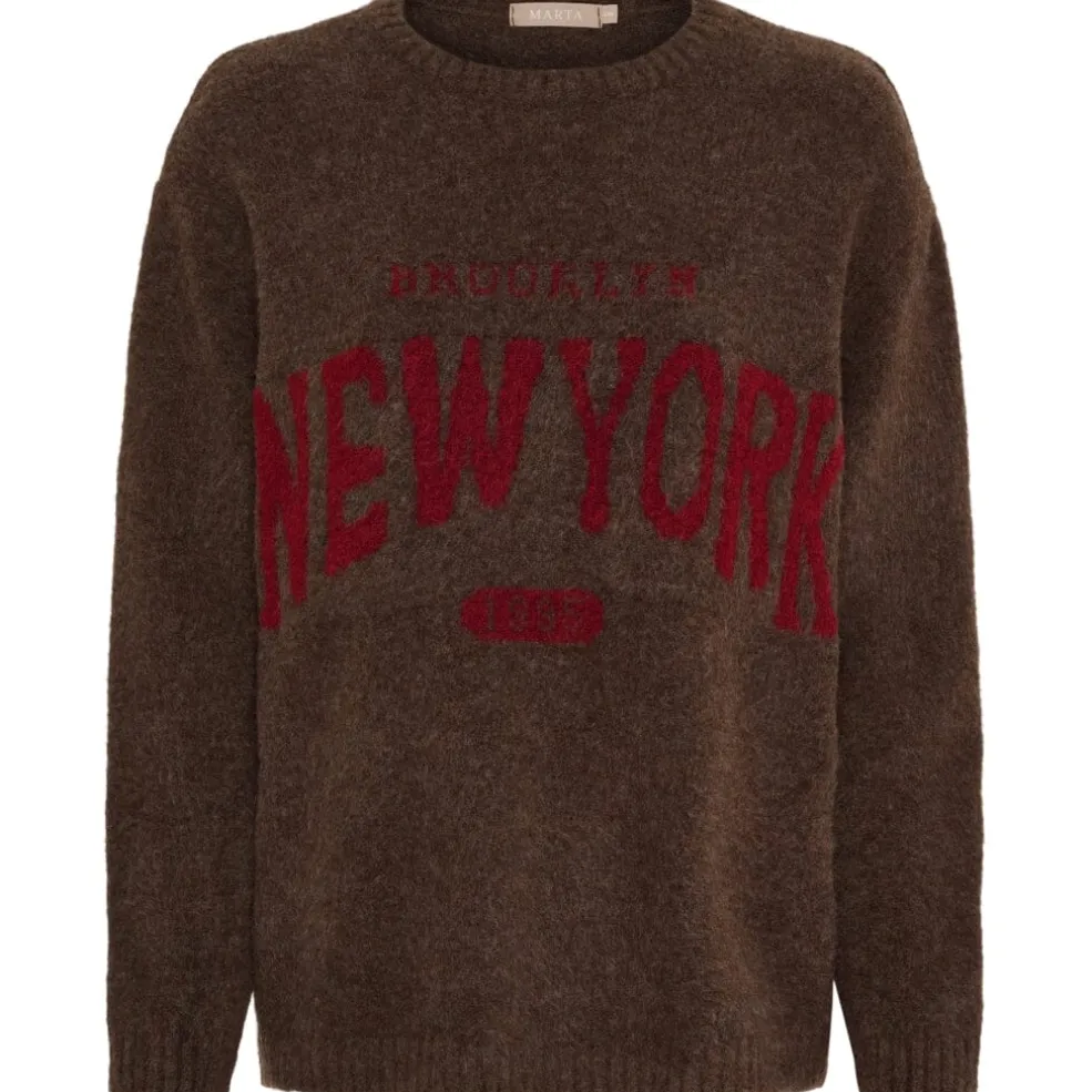 En striktrøje fra Marta Du Chateau i en kombination af brun og bordeauxrød. Trøjen har et marlet mønster med rødt print.