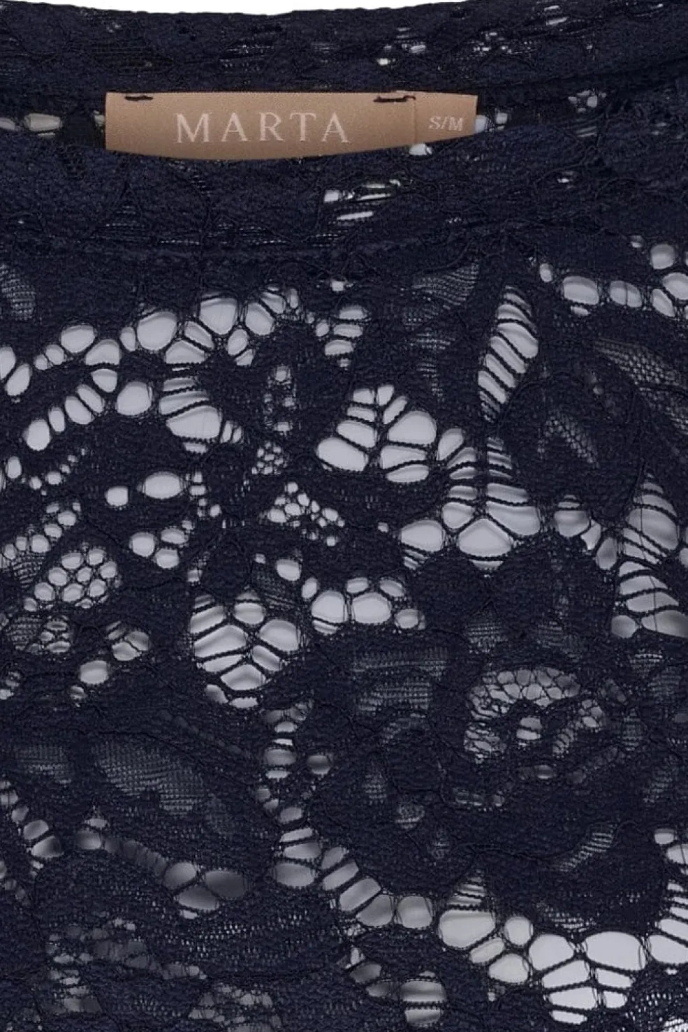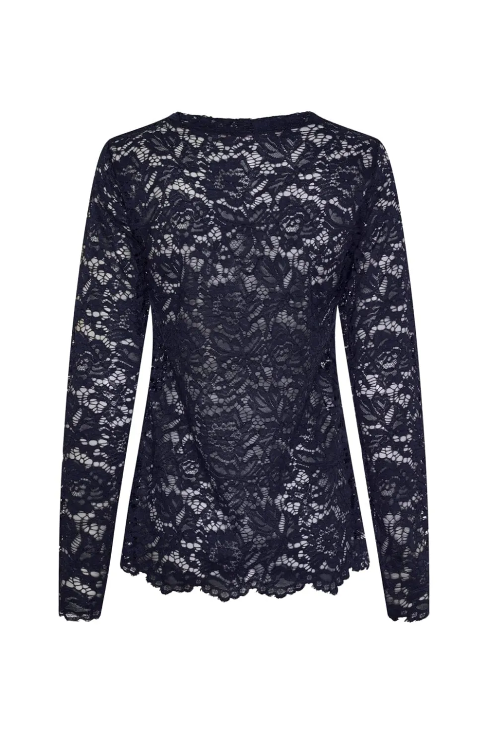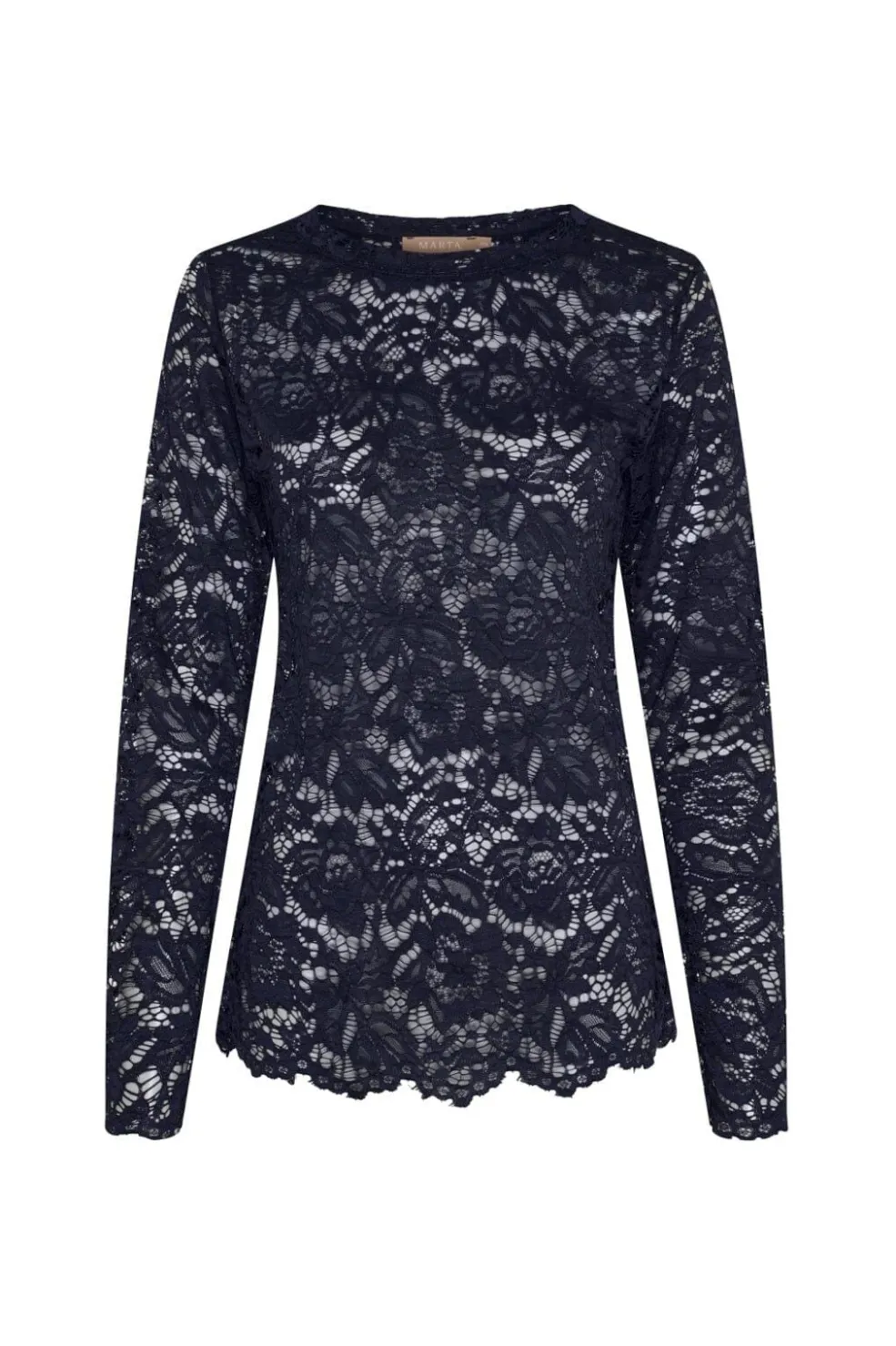 Mørkeblå bluse fra Marta Du Chateau med blomstret blonde-design. Blusen har lange ærmer og en rund halsudskæring, og den er egnet til formelle lejligheder.