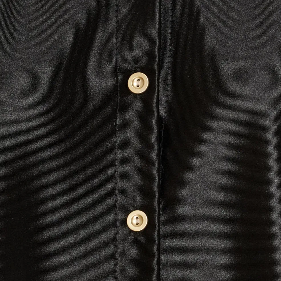 Sort skjorte fra Marta Du Chateau med skinnende overflade. Skjorten har klassisk skjortekrave, oversized pasform og lange ærmer med knaplukning.