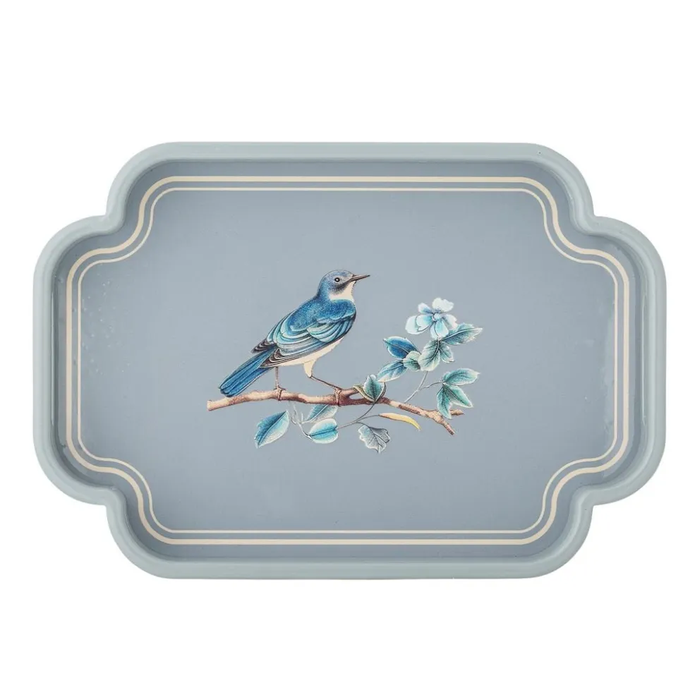 Blåt fad fra Bloomingville med et detaljeret motiv af en fugl på en blomstrende gren. Fadet er lavet af MDF og har afrundede hjørner.