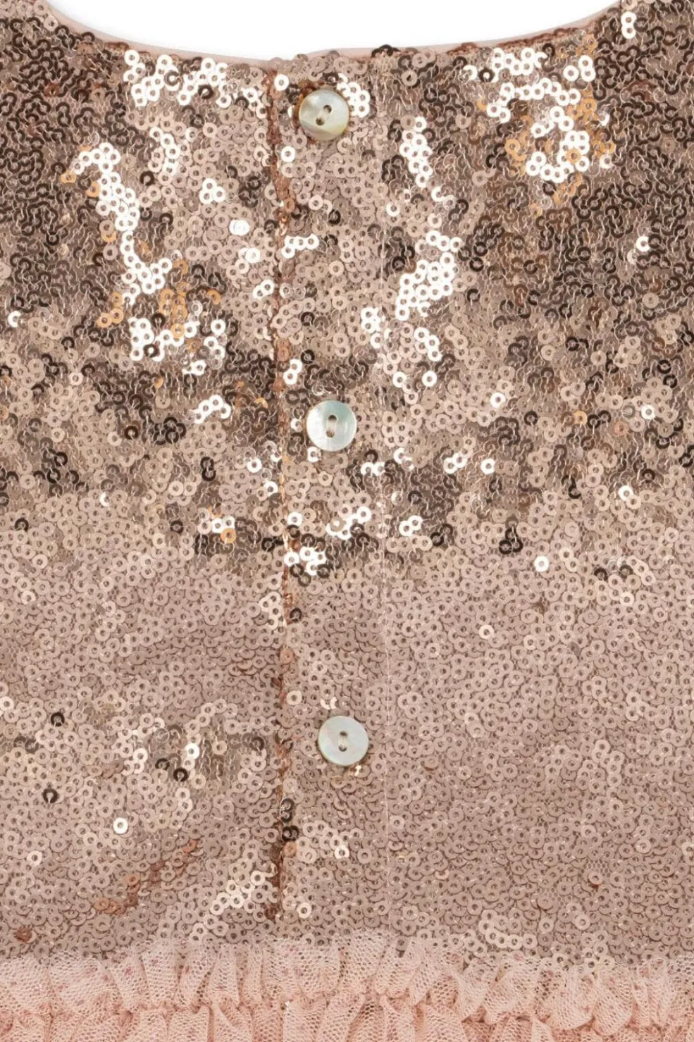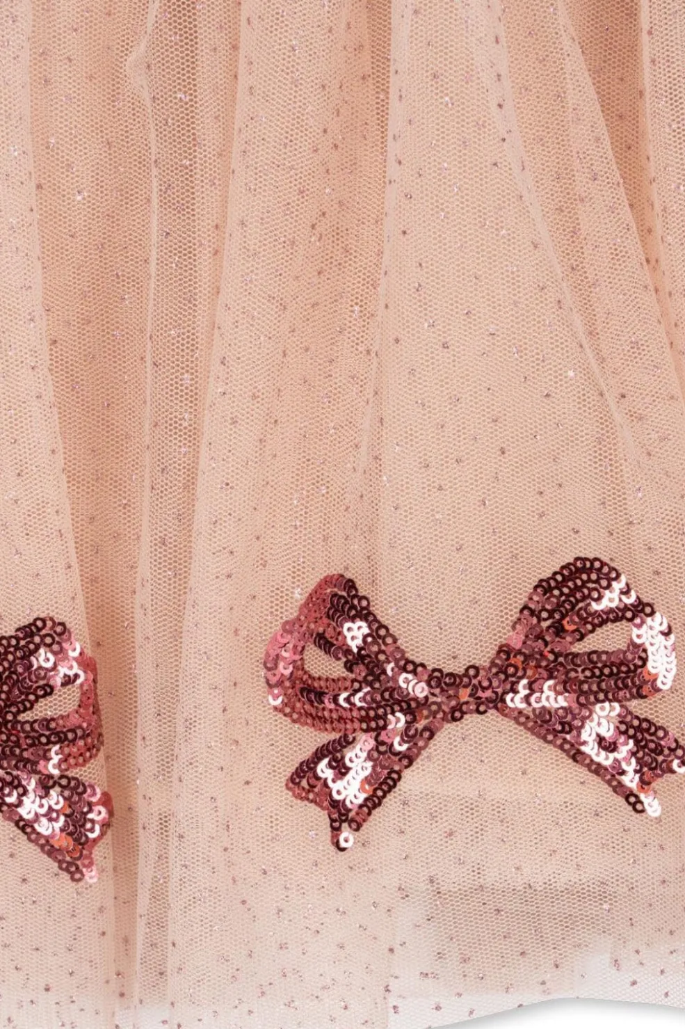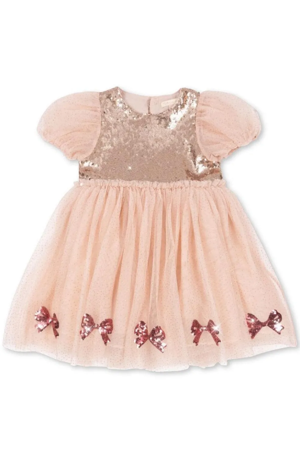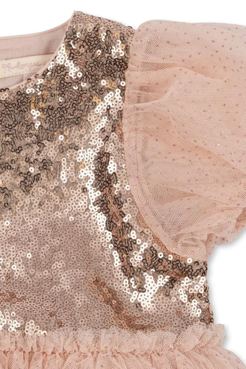 Grå kjole fra Konges Sløjd med prikker og print i lyserøde og gyldne nuancer. Kjolen har pailletter på overdelen og dekorative sløjfer langs kanten af nederdelen.