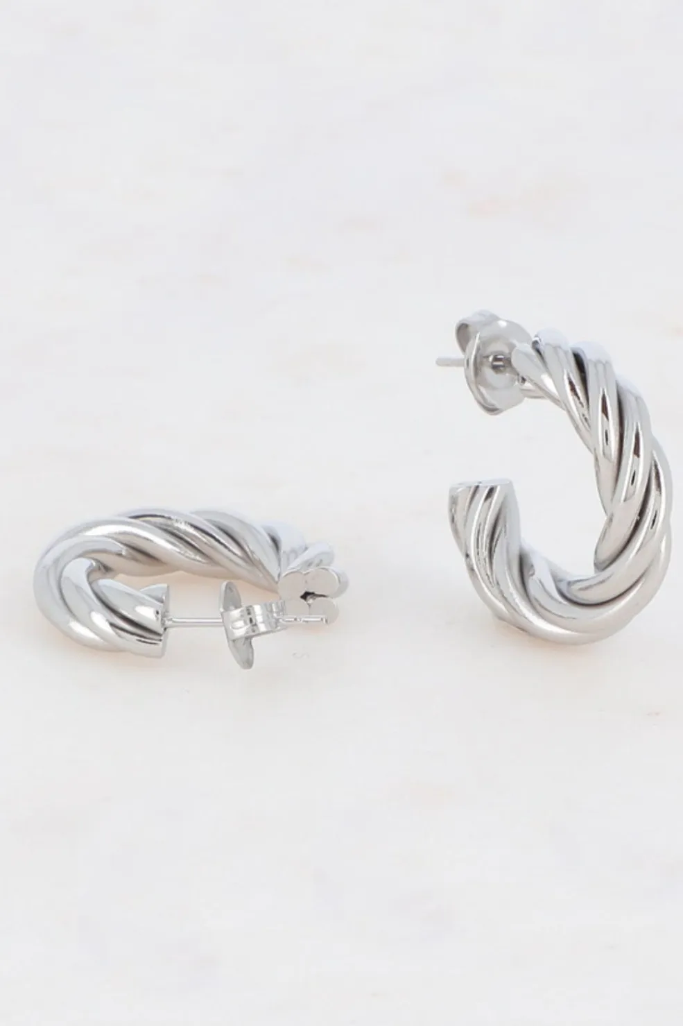 Hoop-øreringe fra Mellow Moon i forsølvet rustfrit stål med snoet design. Det rustfrie stål giver øreringene god holdbarhed, mens den forsølvede overflade skaber et blankt look.