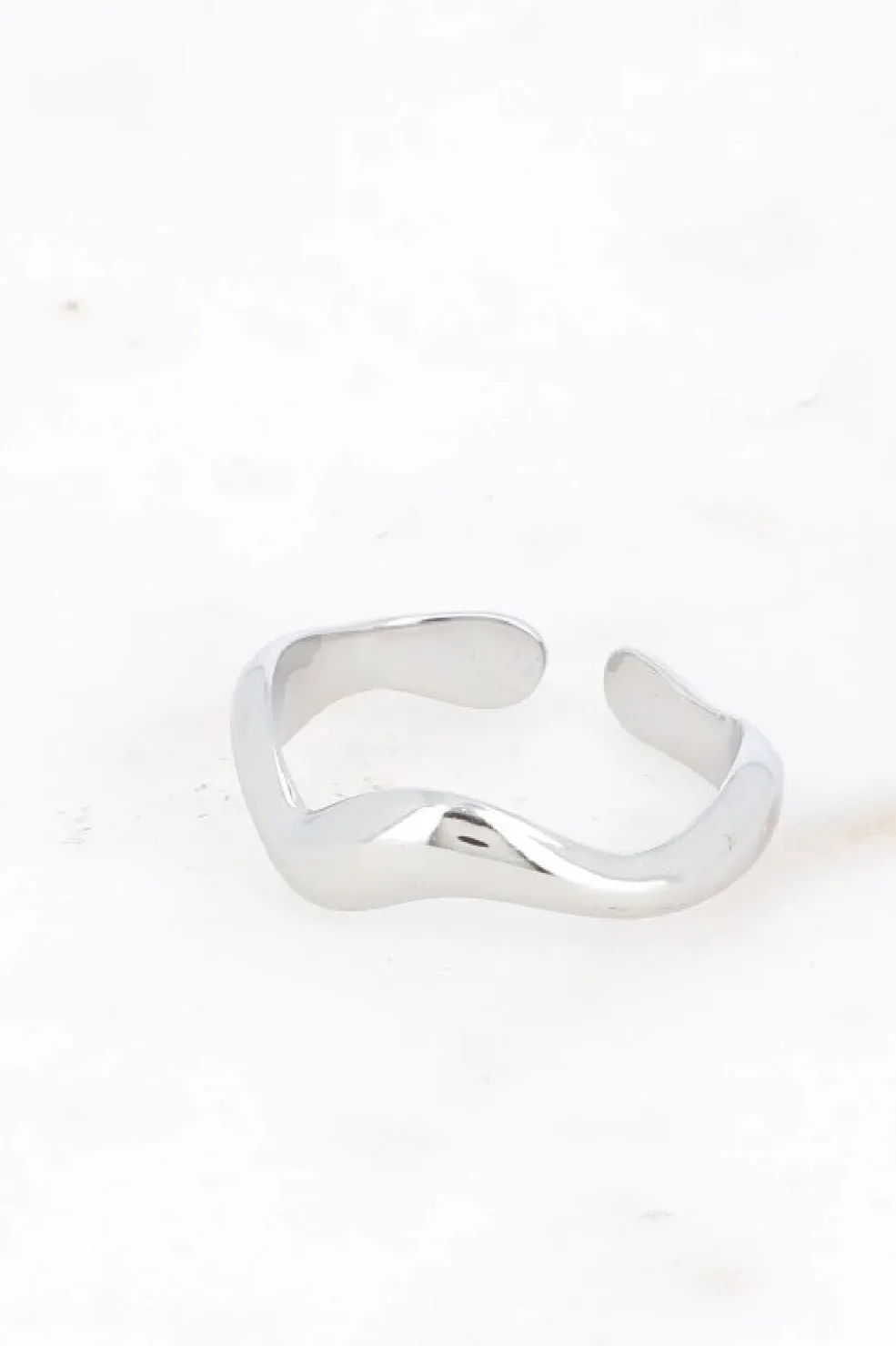 Forsølvet ring fra Mellow Moon med et bølget design. Ringen har en åben ende og er 6 mm høj. Den er fremstillet i rustfrit stål med en glat overflade.
