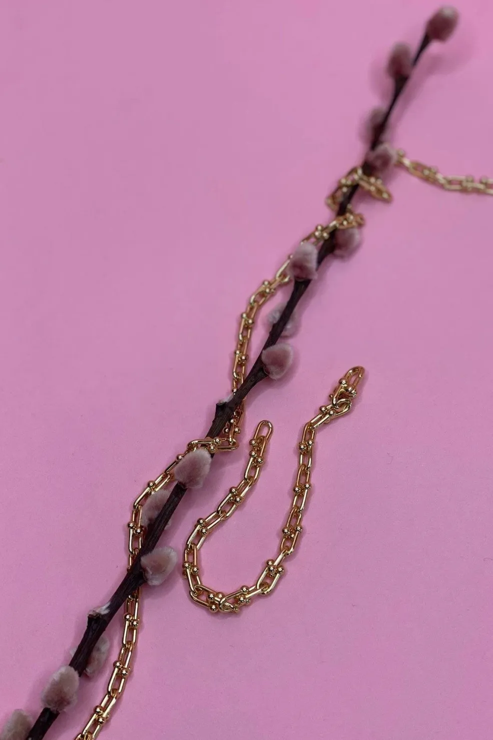 Lænkearmbånd fra Mellow Moon med kugledetaljer. Lavet af forgyldt messing med et kædedesign, der kombinerer runde kugler med aflange led.