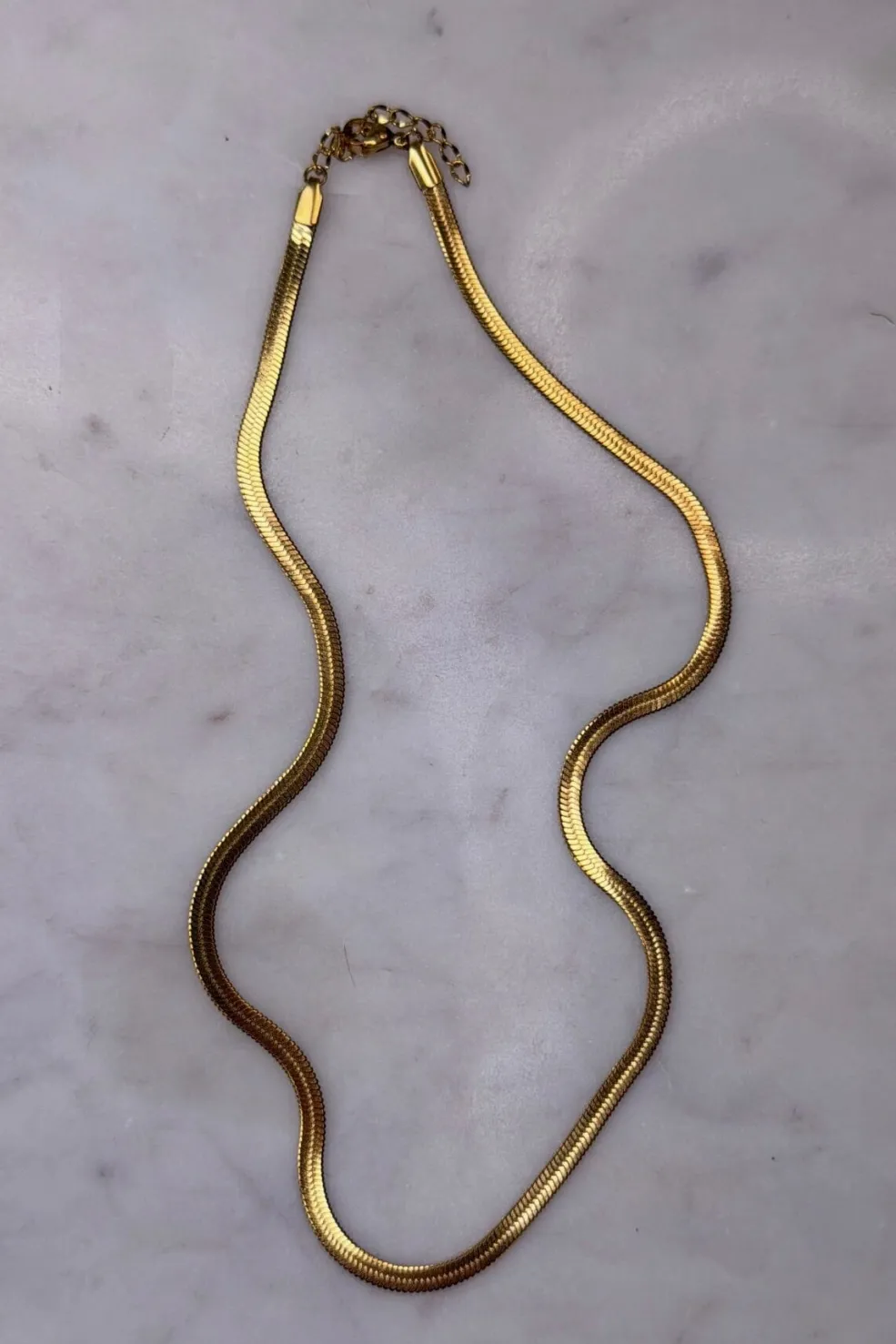 Forgyldt halskæde fra Mellow Moon med en slangeagtig kæde. Den gyldne overflade giver smykket et blankt udseende, og kæden passer til både festlige og formelle anledninger.