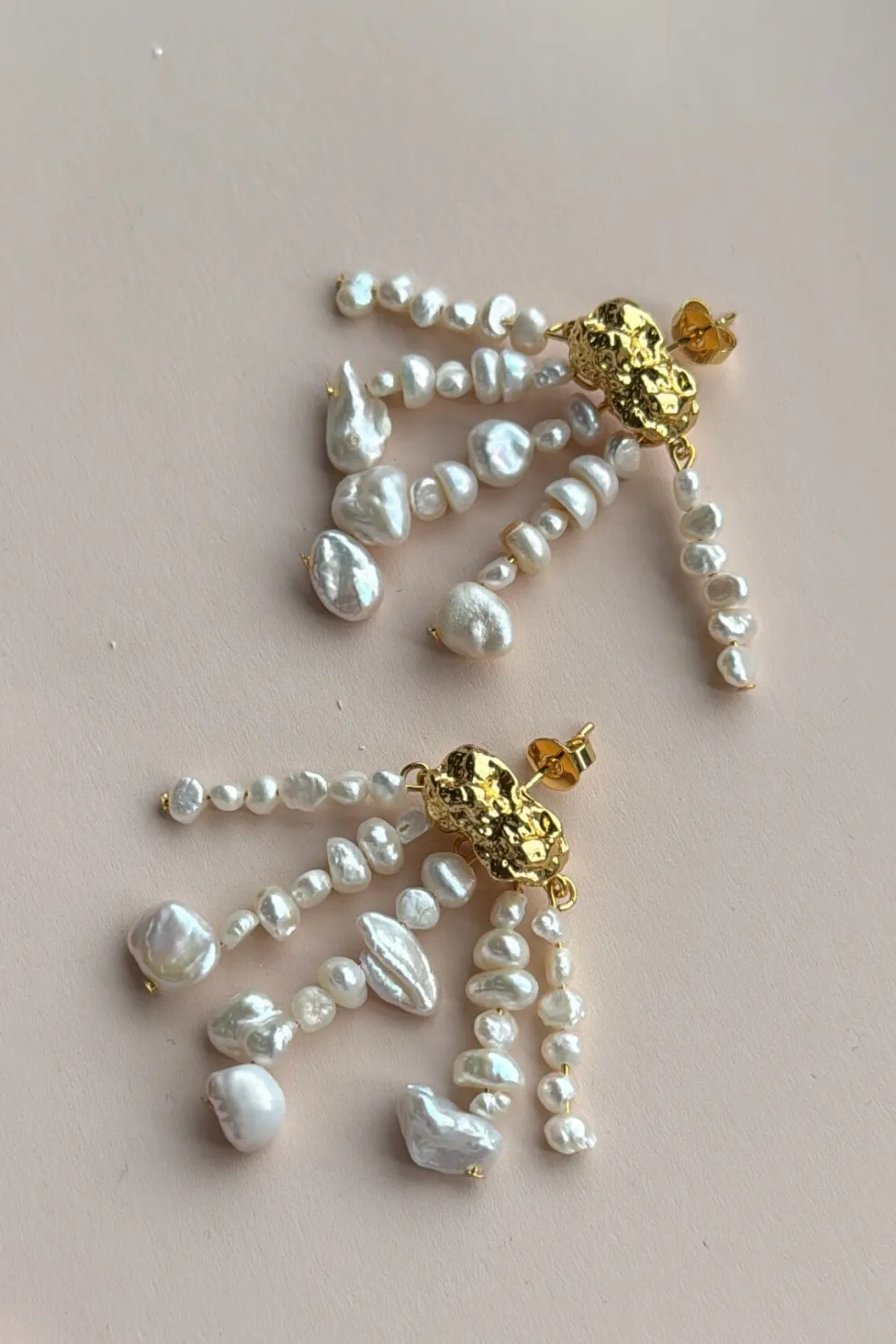 Forgyldte ørestik fra Mellow Moon med fem rækker af perler i forskellige størrelser. Den gyldne top kombineres med hvide og cremefarvede perler, der skaber en fin bevægelse.