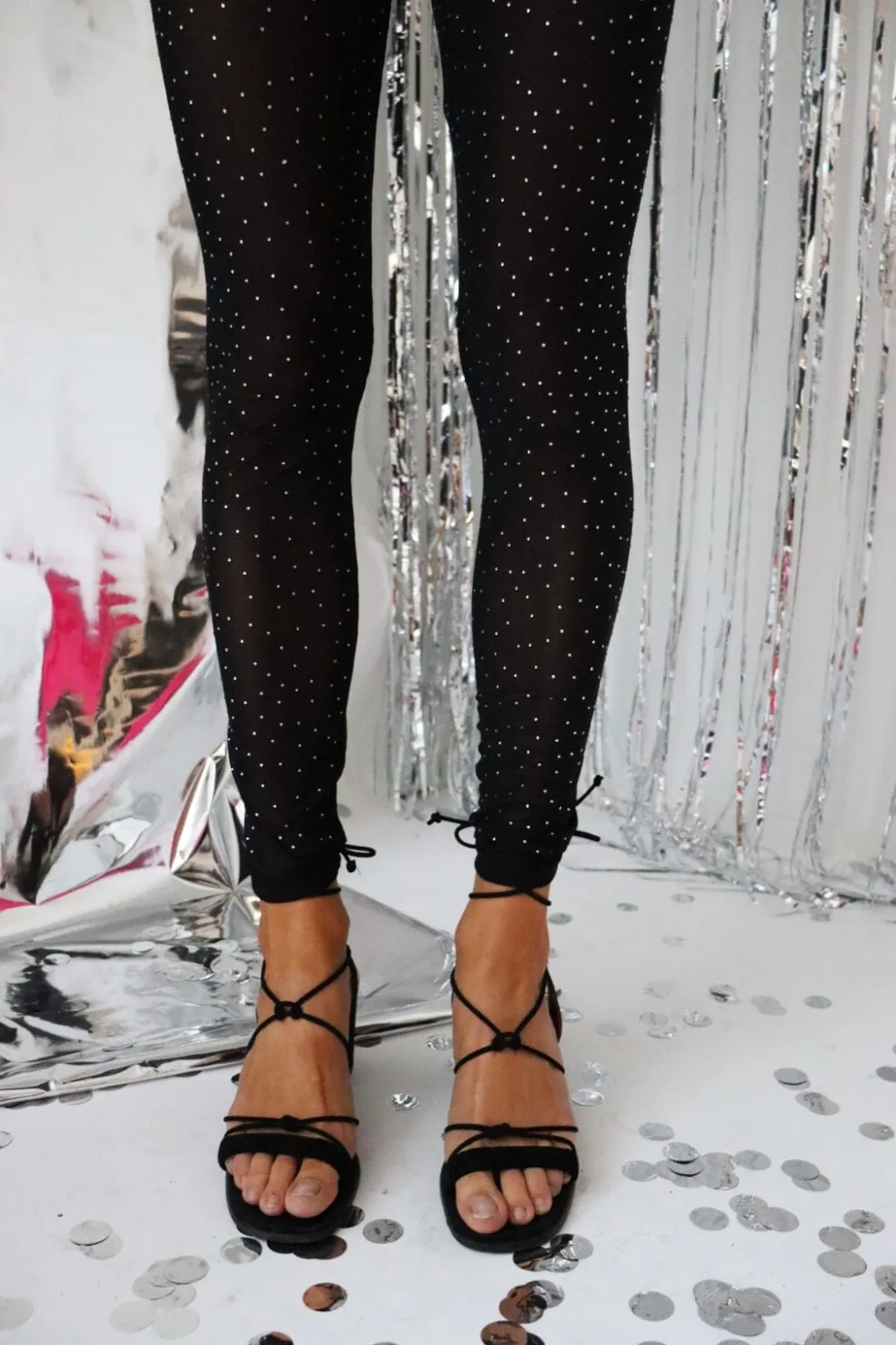 Sorte leggings fra Liberte med glimtende diamantprikker over hele benet. Den ankellange model har snøredetaljer og et tætsiddende design med regular taljehøjde.