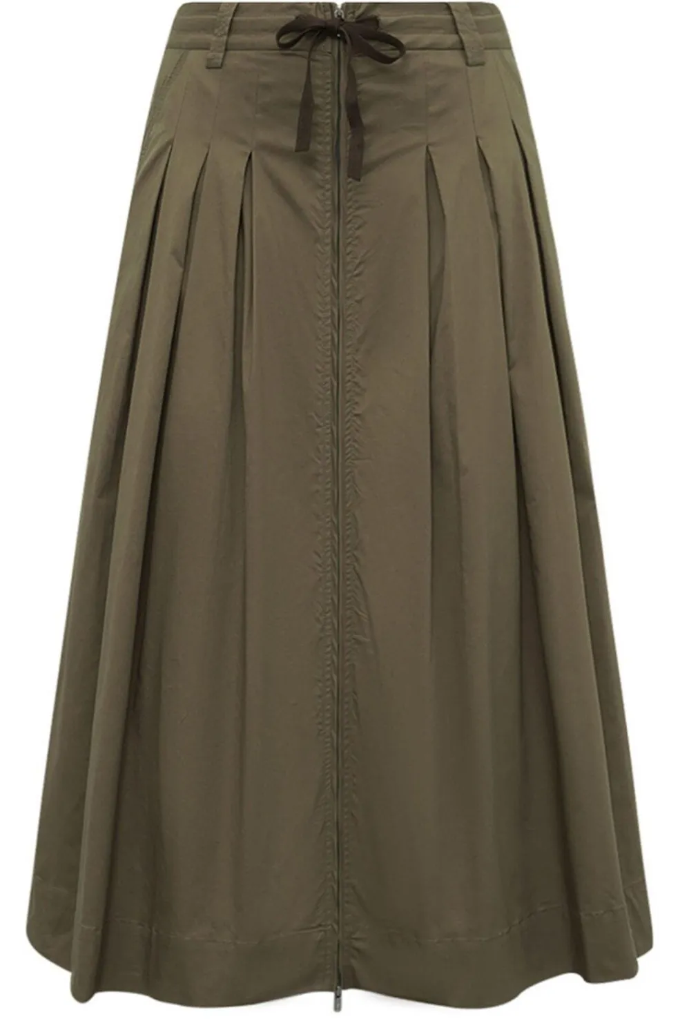 Khaki-brun nederdel fra Gossia med plisseret design. Nederdelen har en længde til midt på læggen og en snøredetalje i taljen sammen med en lynlås.