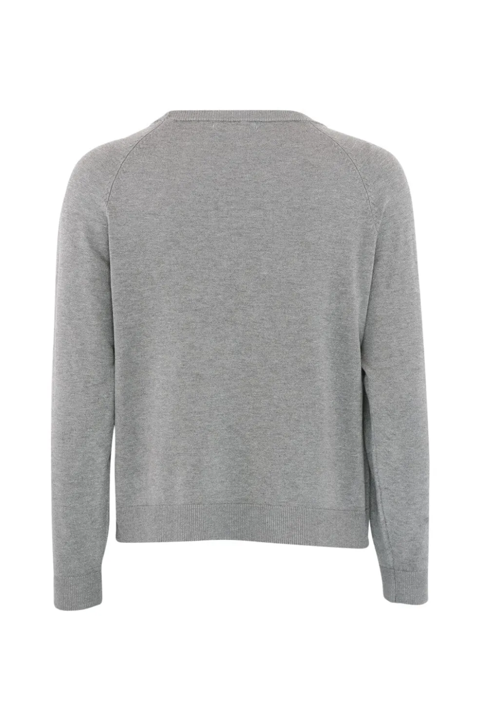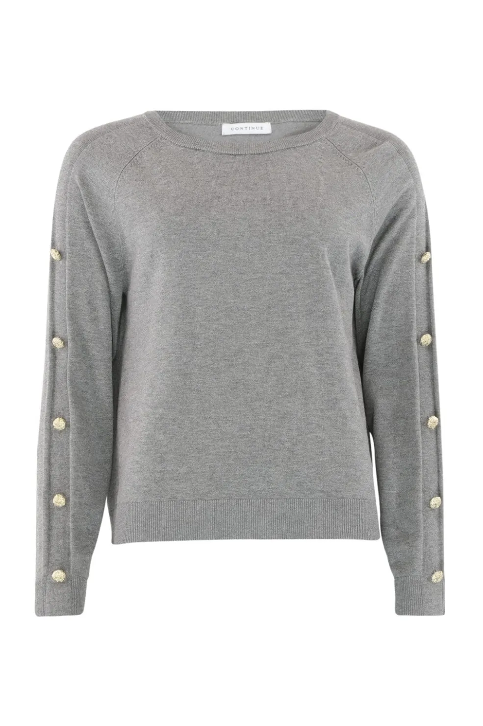 Grå strikbluse fra Continue med dekorative knapper langs ærmerne. Blusen har en rund halsudskæring og lange ærmer i en meleret grå nuance.