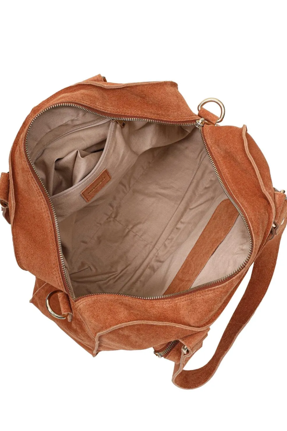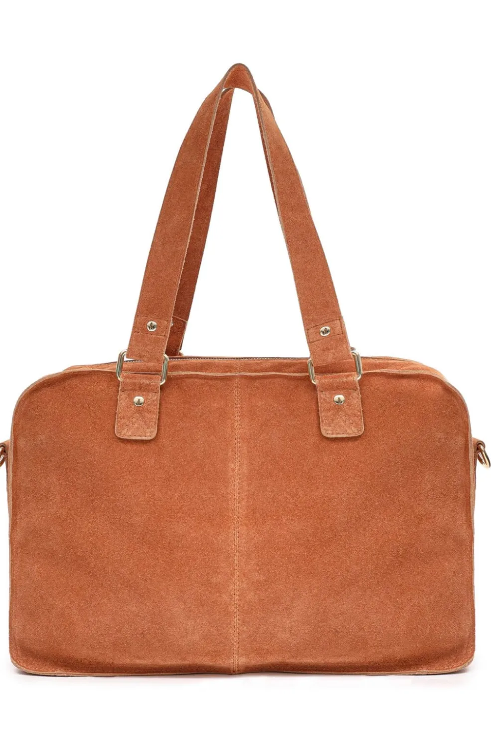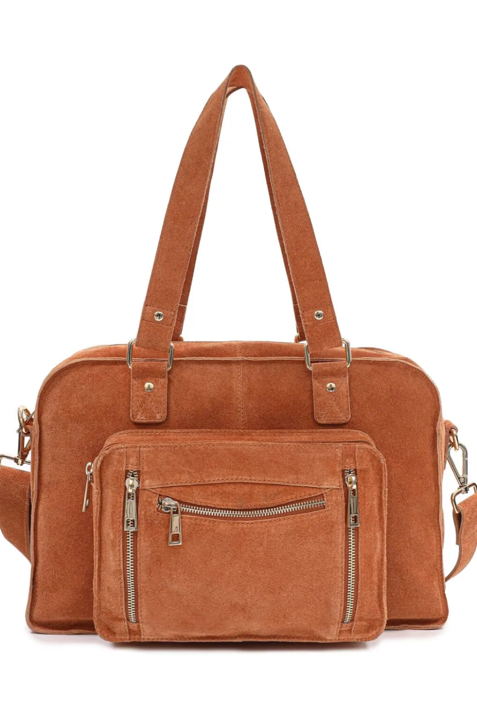 Håndtaske fra Núnoo i toffee-farvet ruskind med guldfarvede detaljer. Tasken har flere rum og en praktisk lynlåslomme på forsiden med plads til småting.