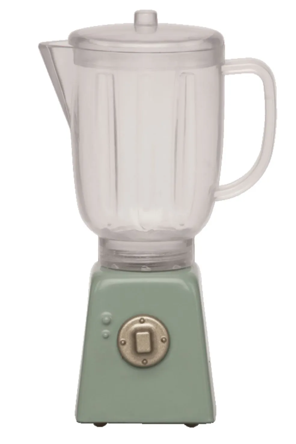 En miniatureblender fra Maileg med en gennemsigtig kande og mintgrøn base. Den er designet til leg i køkkenet og har en realistisk udformning med låg og håndtag.