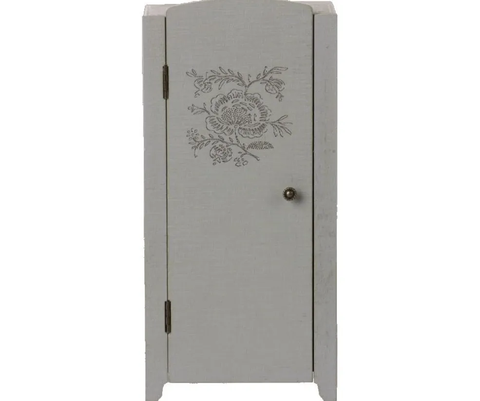 Et gråt miniature skab med blomstermønster på lågen. Skabet har indvendigt tapet og hylder, der passer til Maileg dukkehuset og giver plads til små legesager.