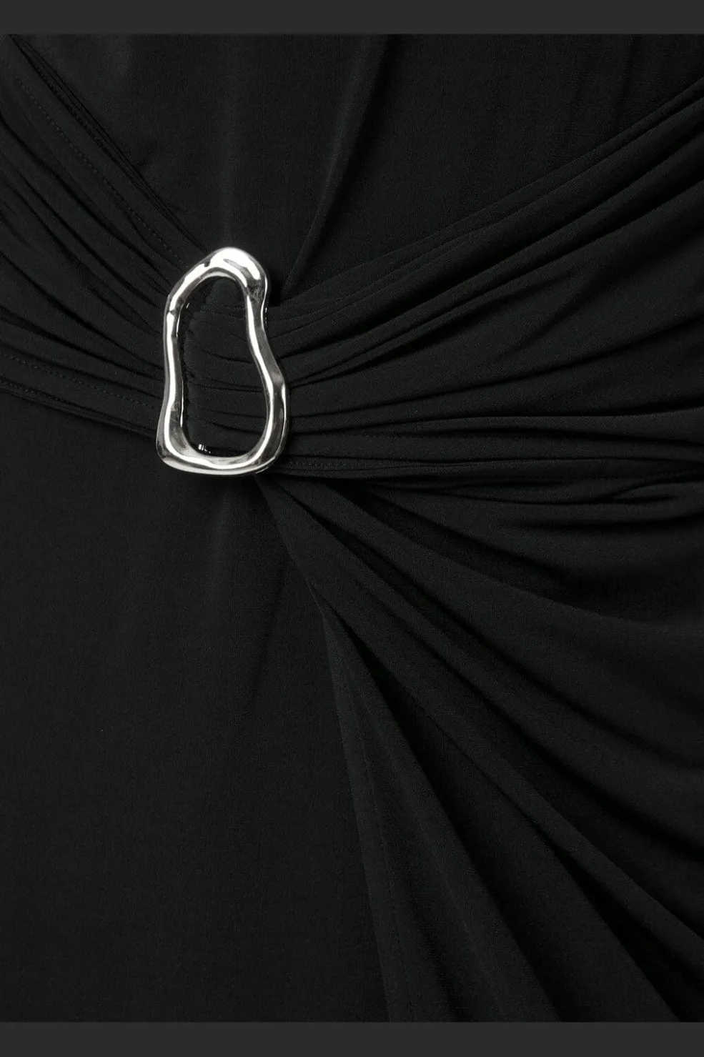 Sort kjole fra Neo Noir med drapering i taljen og sølvspænde. Kjolen har korte ærmer, rund hals og går til midt på læggen. Den slanke pasform følger kroppens linjer.