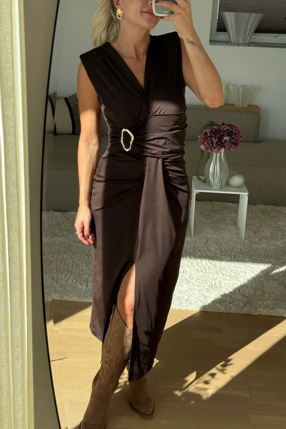 Mørkebrun kjole fra A-bee, lavet af 100 % polyester. Kjolen har et dekorativt guldfarvet spænde i taljen og rynkede detaljer.