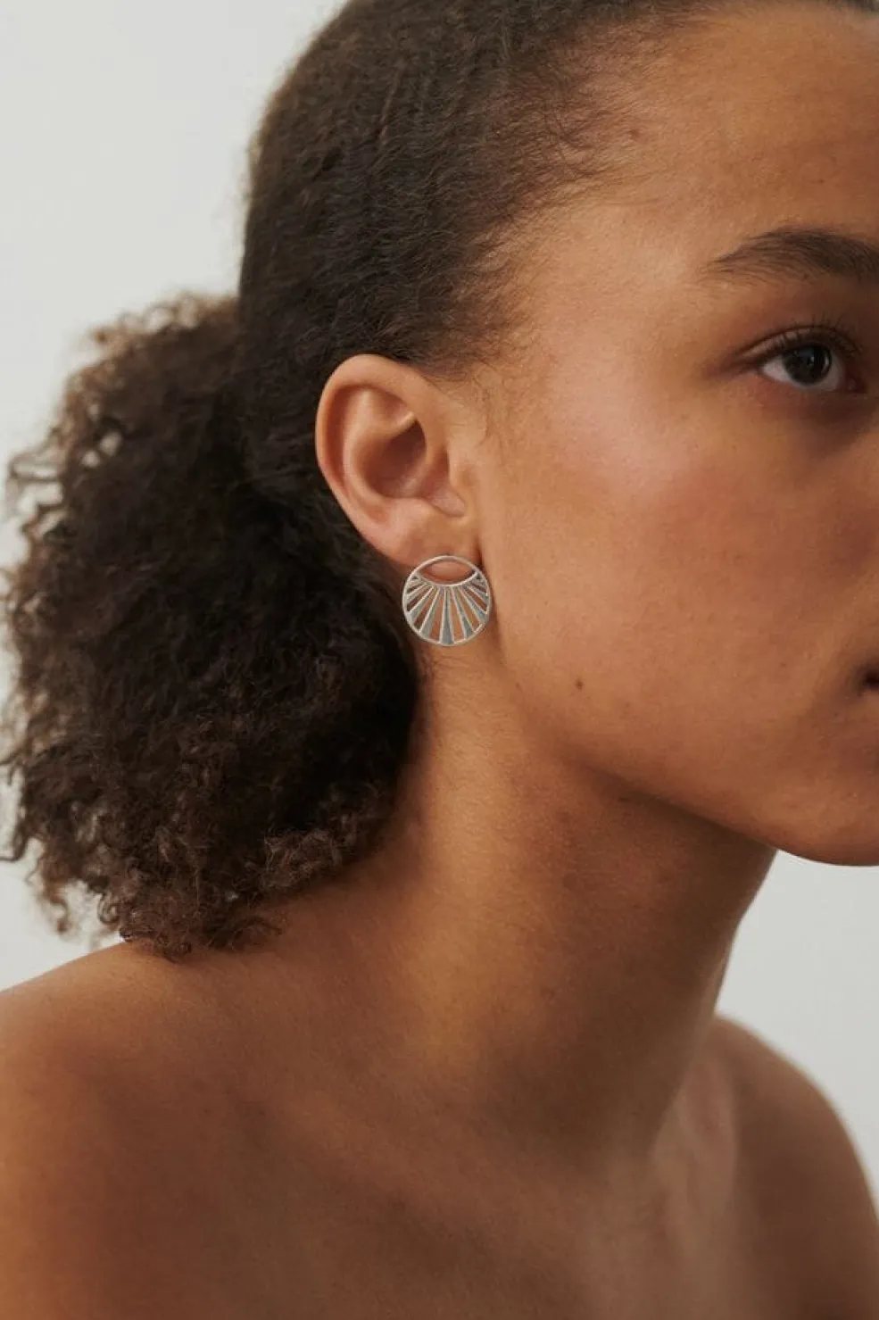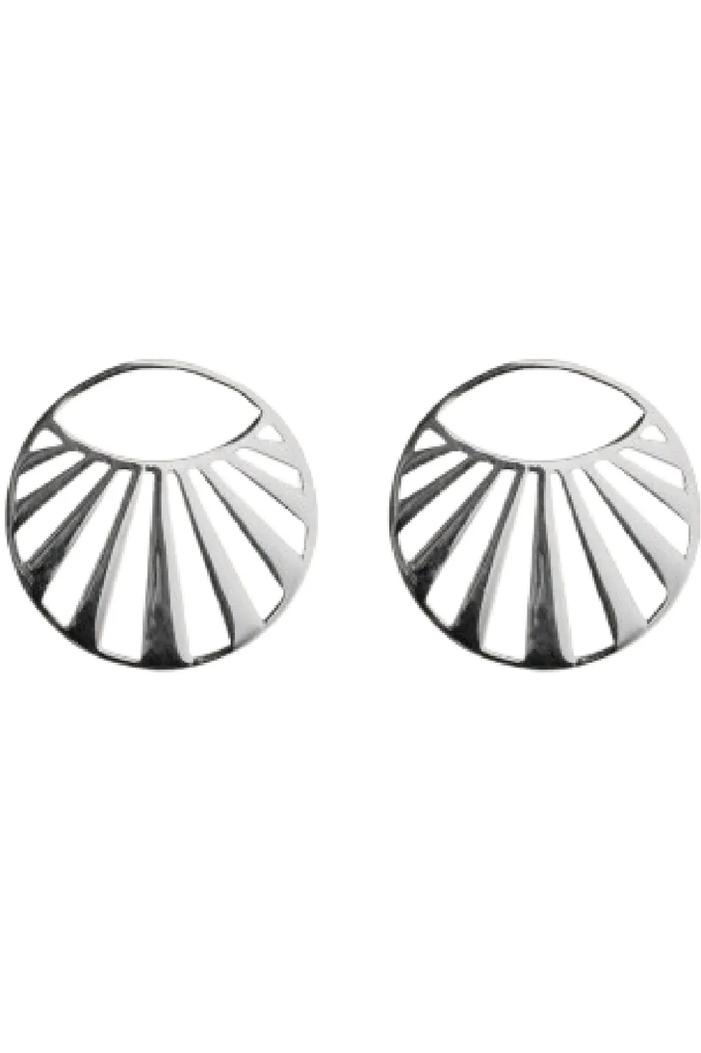 Sølvøreringe fra Pernille Corydon med rund form og solstrålemønster. Øreringene har udskårne sektioner, der skaber et let og luftigt design.