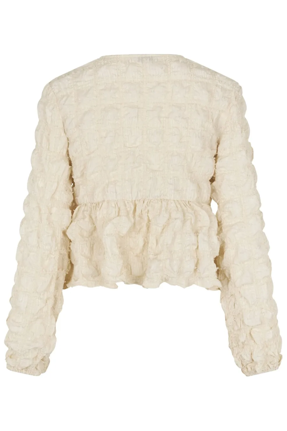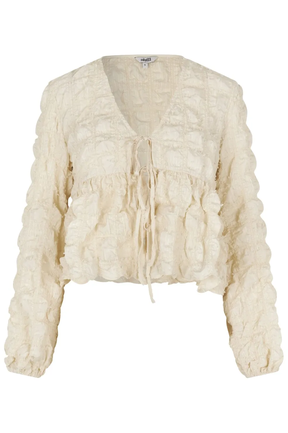 Bluse fra MbyM i en cremehvid oyster-nuance. Den har rynkedetaljer over det hele og bindebånd ved V-udskæringen. De lange ærmer har flæser, der giver blusen struktur.