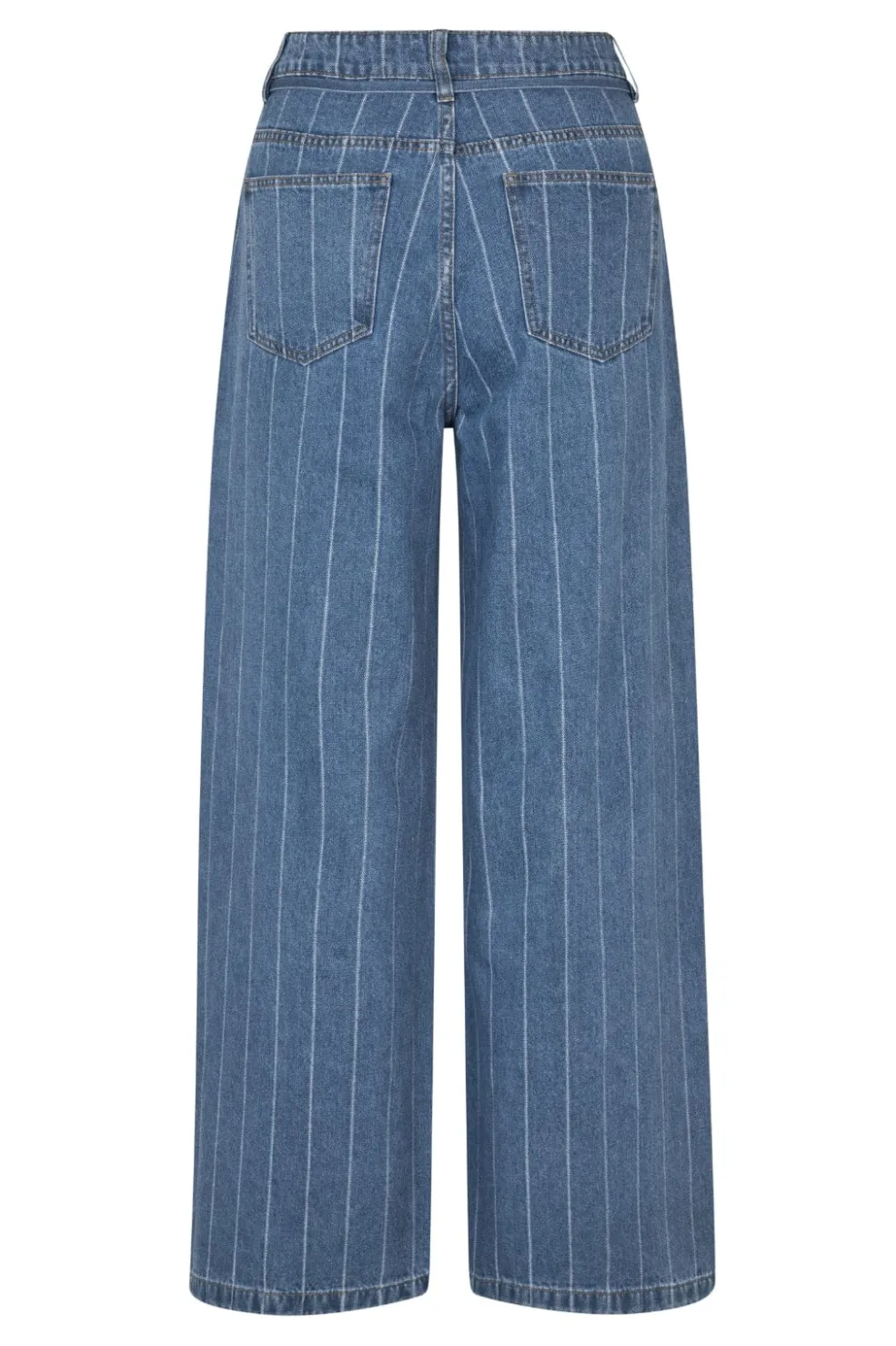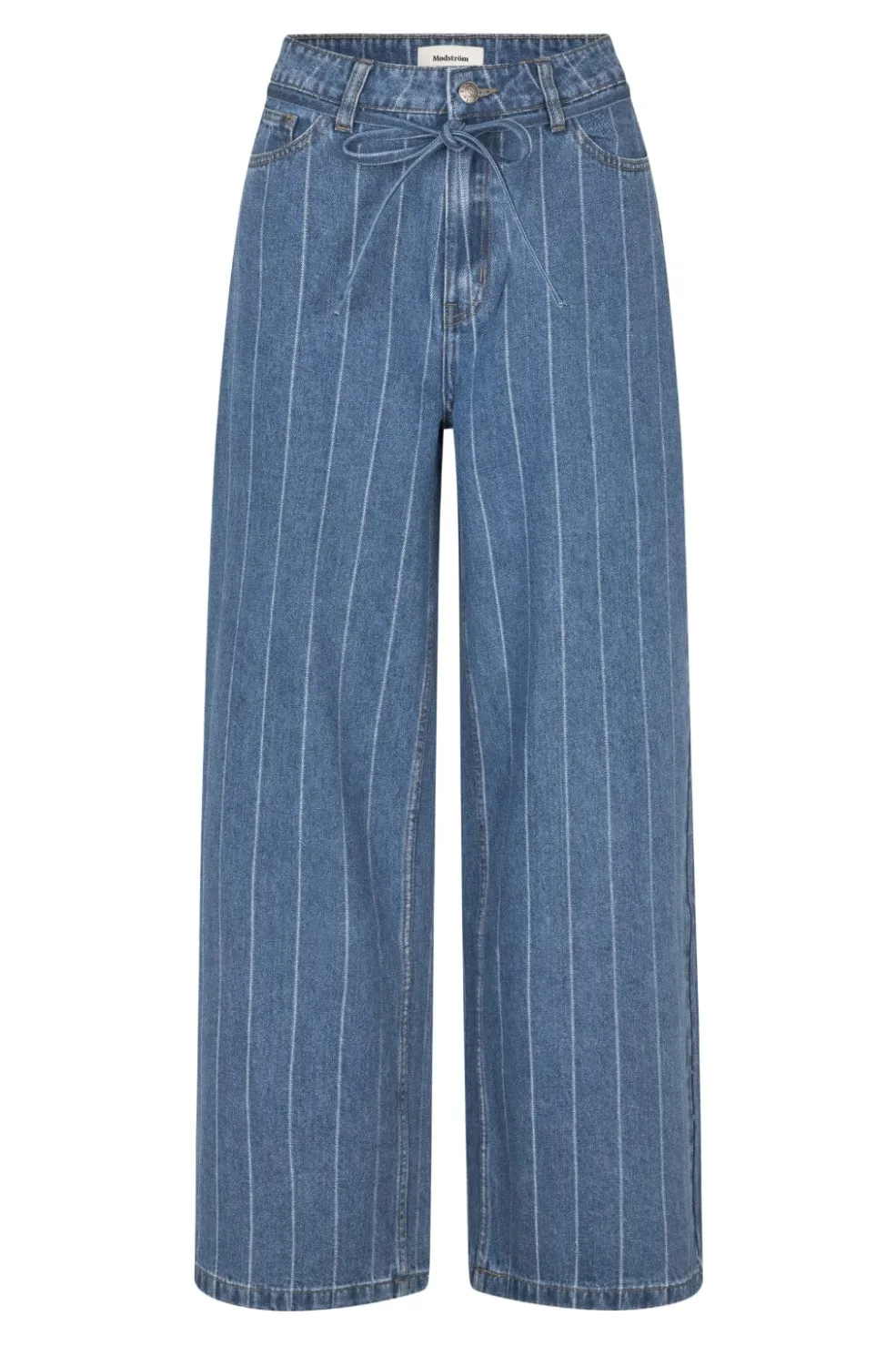 Stribede bukser fra Modström i jacquard denim med høj talje og bindebånd. De brede ben og det stribede mønster giver bukserne et særligt præg.