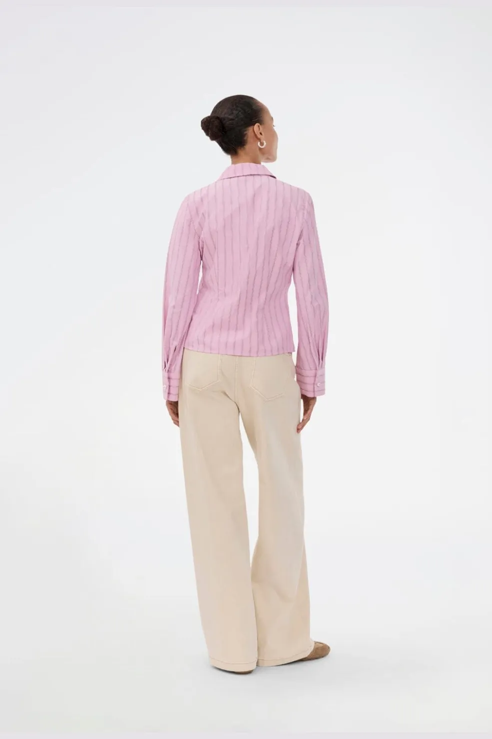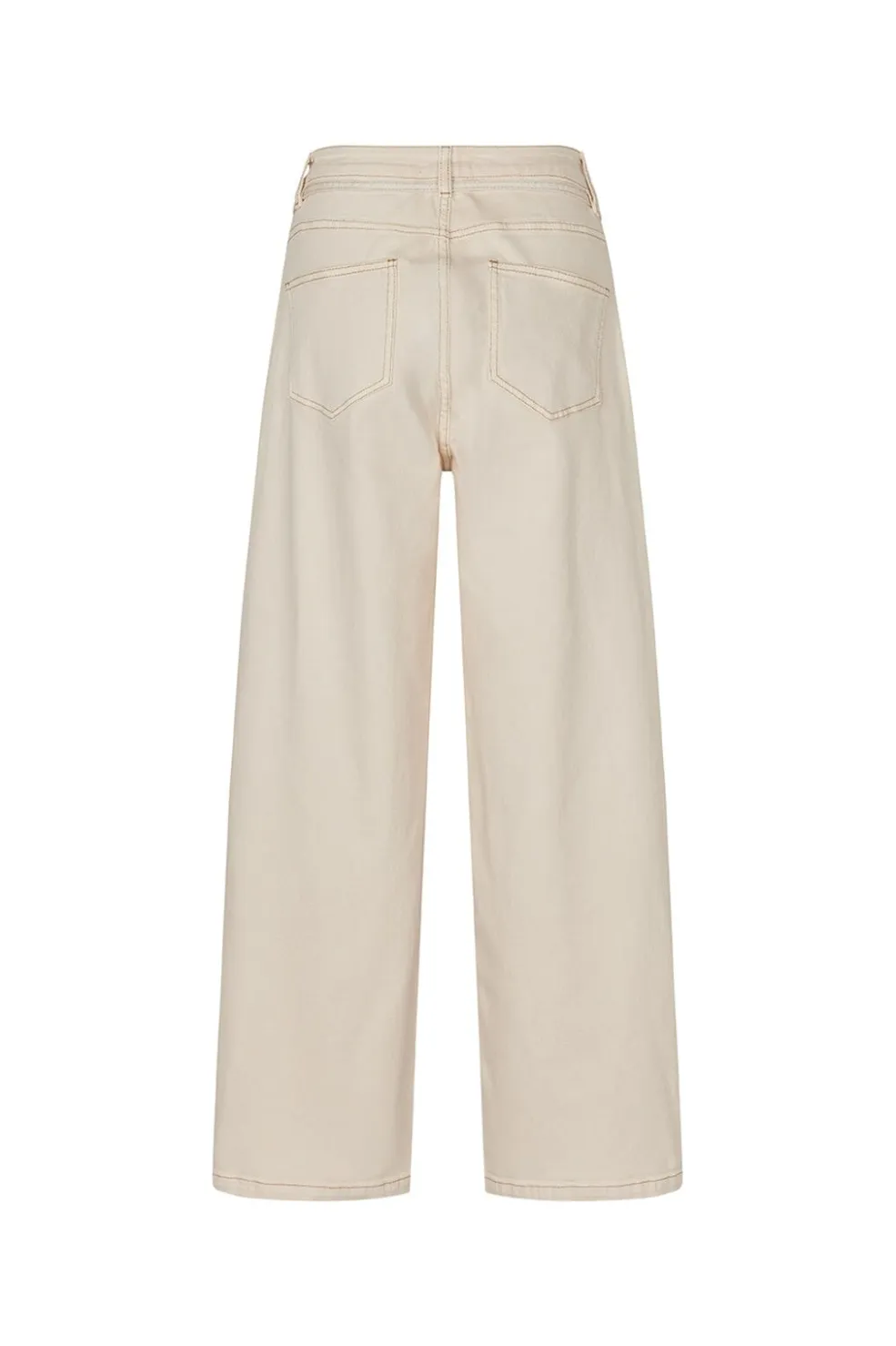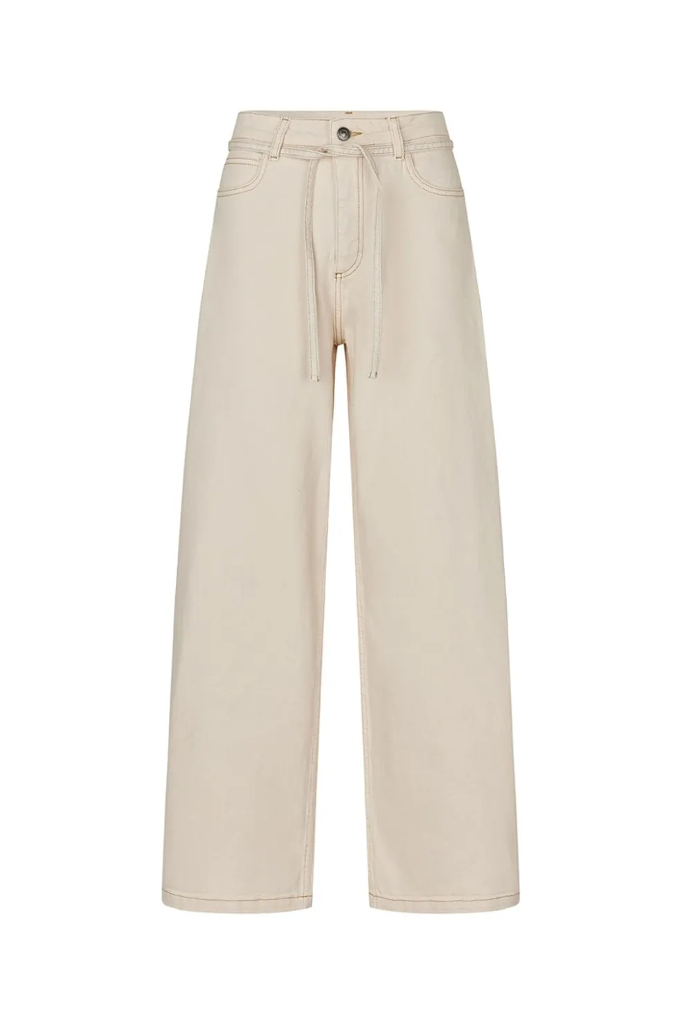 Sandfarvede bukser fra Modström i en blød bomuldsblanding. De har en høj talje og løs pasform med gulvlang længde. Dekorative syninger og bindebånd giver bukserne et personligt præg.