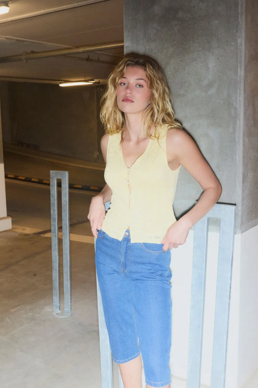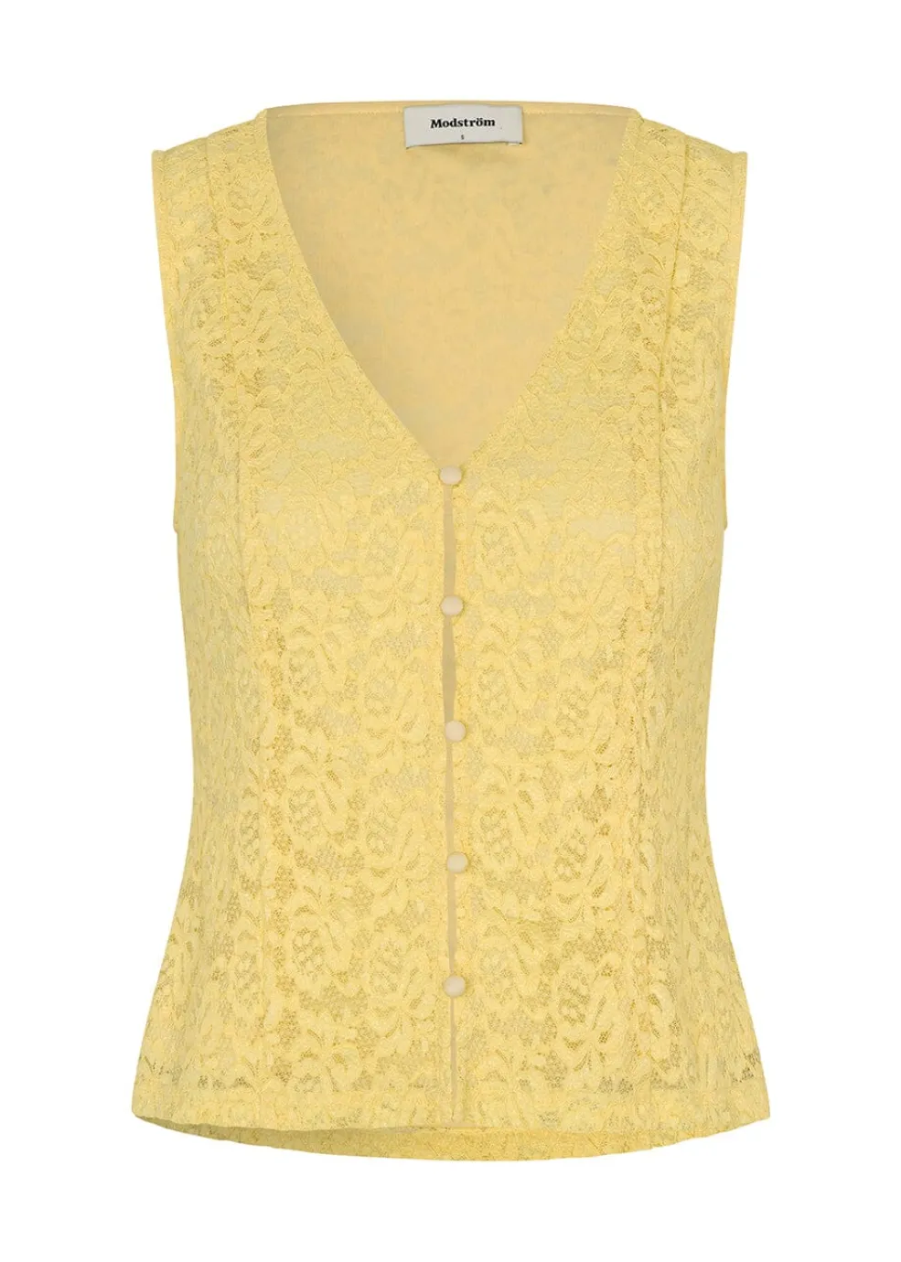Gul top fra Modström med blondedetaljer og v-udskæring. Toppen har knaplukning foran og indvendigt foer, der giver et pænt fald.