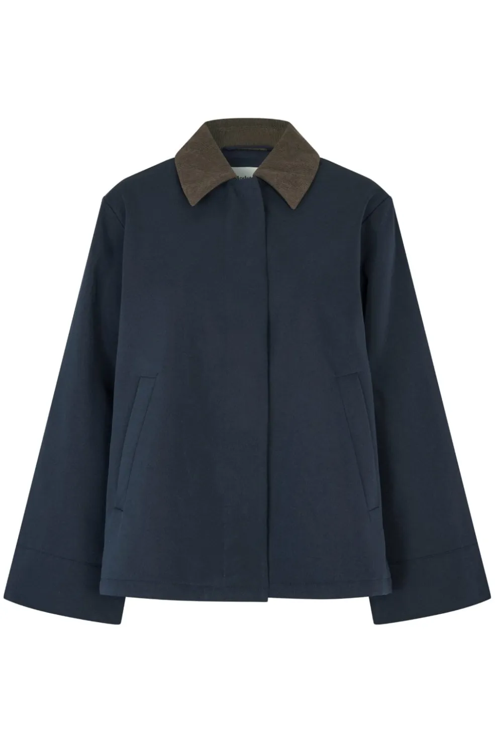 Mørkeblå jakke fra Modström med brun fløjlskrave. Jakken har en løs pasform og skjult knaplukning foran. To sidelommer giver praktisk opbevaringsplads.
