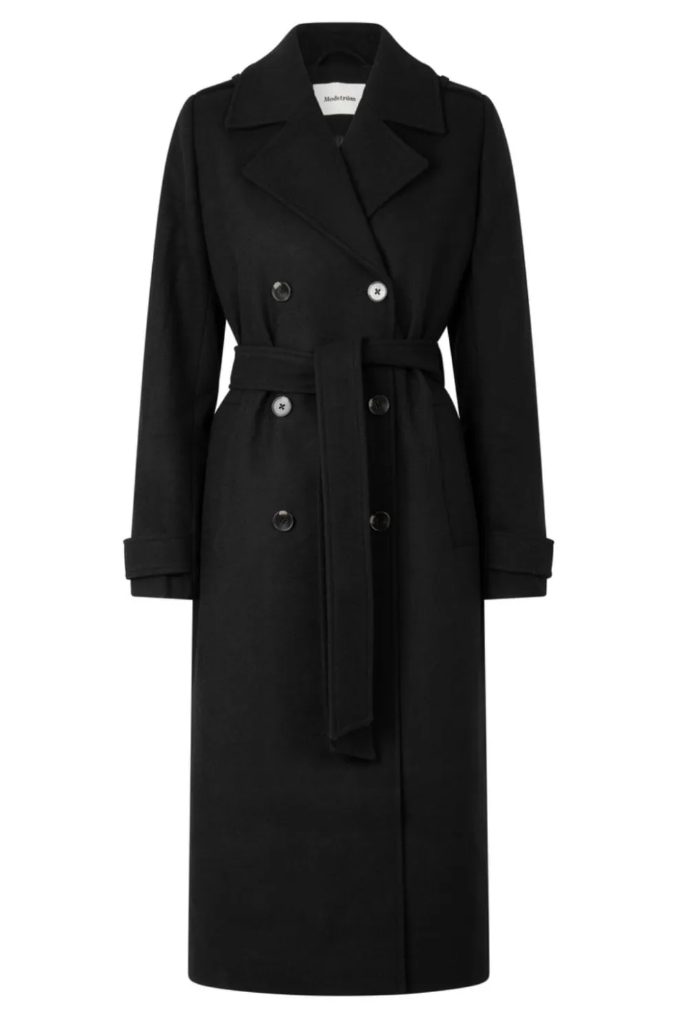 Sort uldfrakke fra Modström med dobbeltradet lukning og bælte i taljen. Frakken har en klassisk skjortekrave, skulderstropper og brede manchetter.