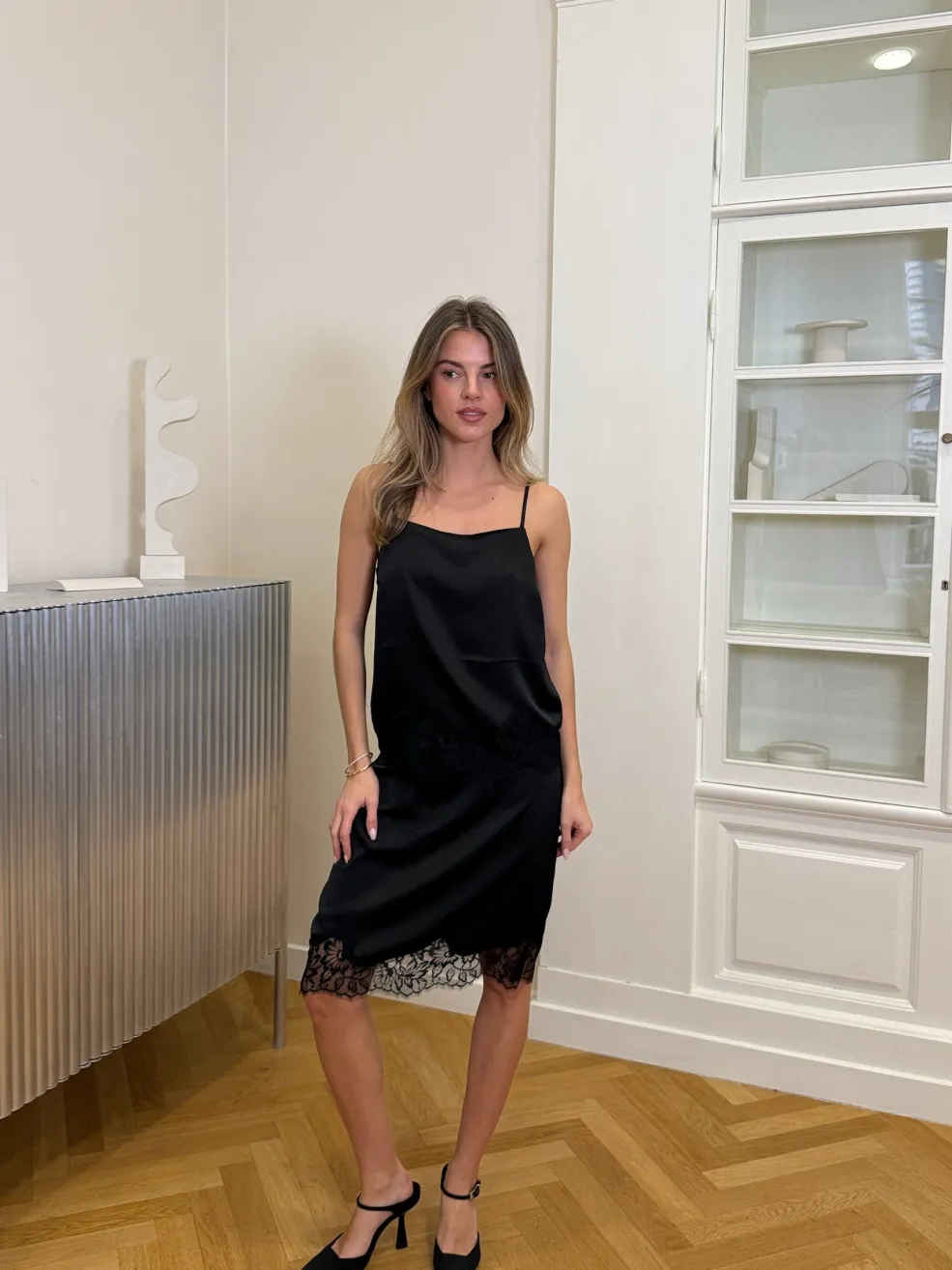 Sort nederdel fra Modström i 100 % polyester med en dekorativ blondekant nederst. Nederdelen har elastik i taljen og går til låret.
